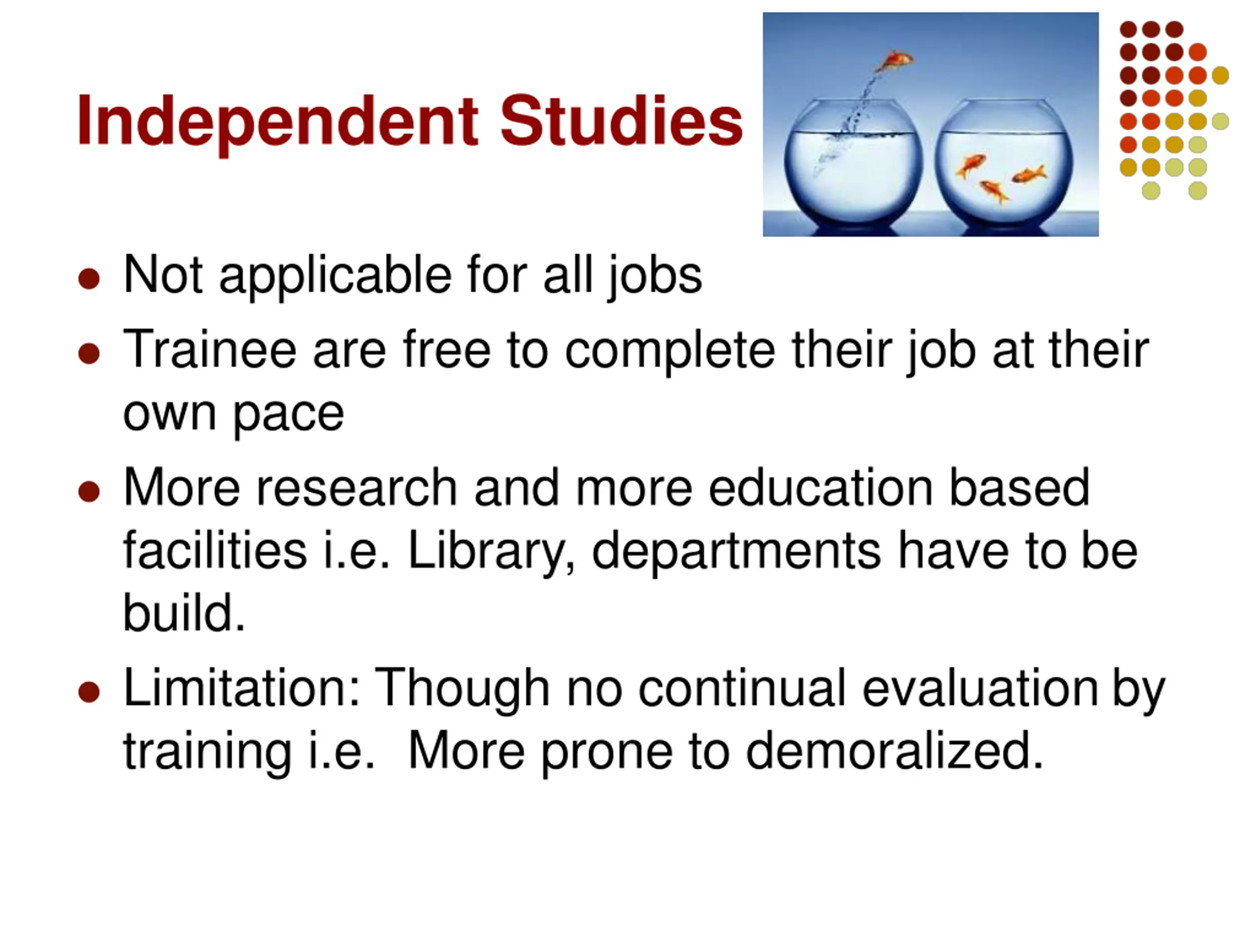Independent Studies Not applicable for all jobs Trainee are free to complete their job at their own pace More research and more education based facilities i.e. Library, departments have to be build. Limitation: Though no continual evaluation by training i.e. More prone to demoralized.