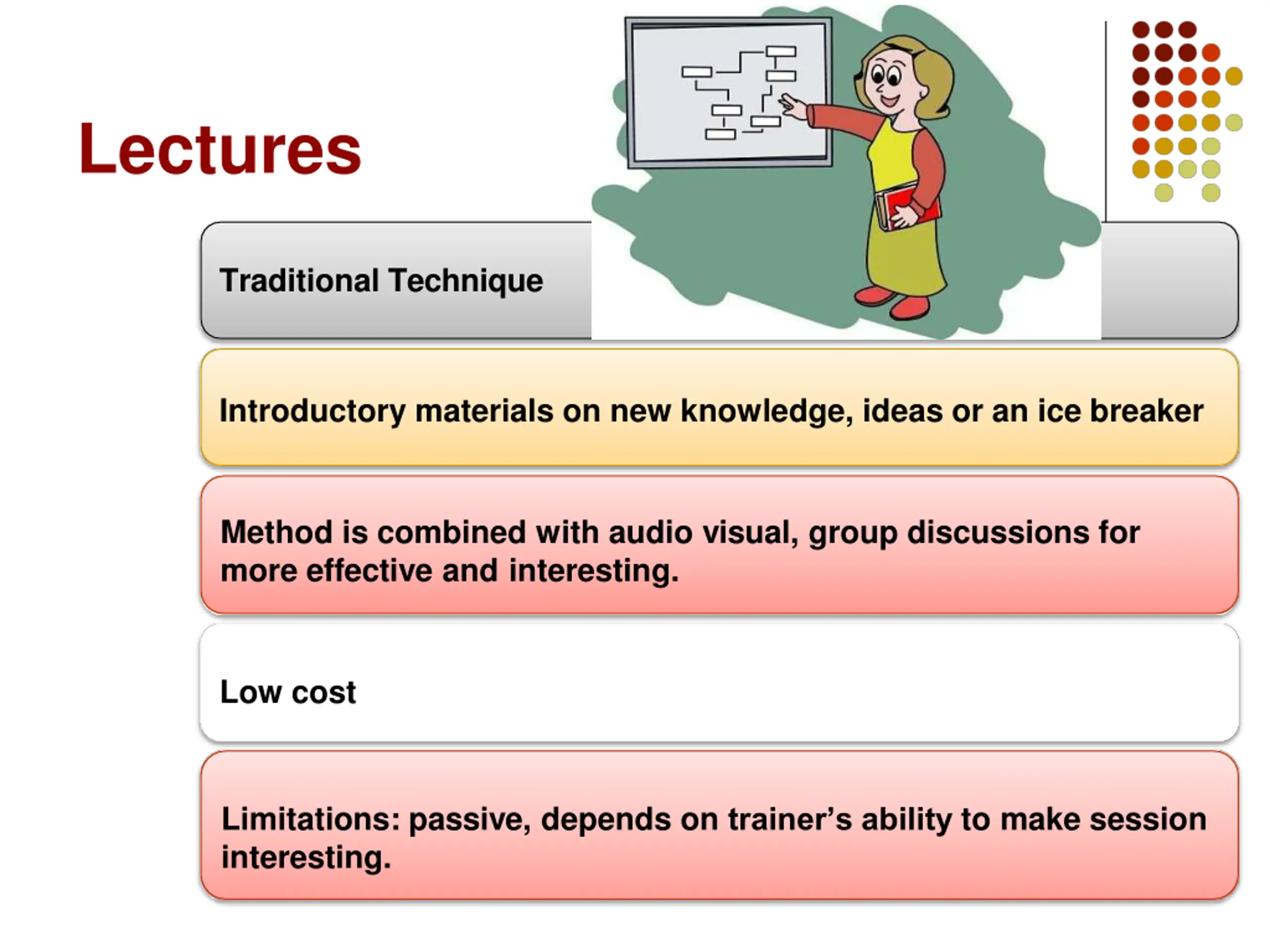 Lectures Traditional Technique Introductory materials on new knowledge, ideas or an ice breaker Method is combined with audio visual, group discussions for more effective and interesting. Low cost Limitations: passive, depends on trainer s ability to make session interesting.