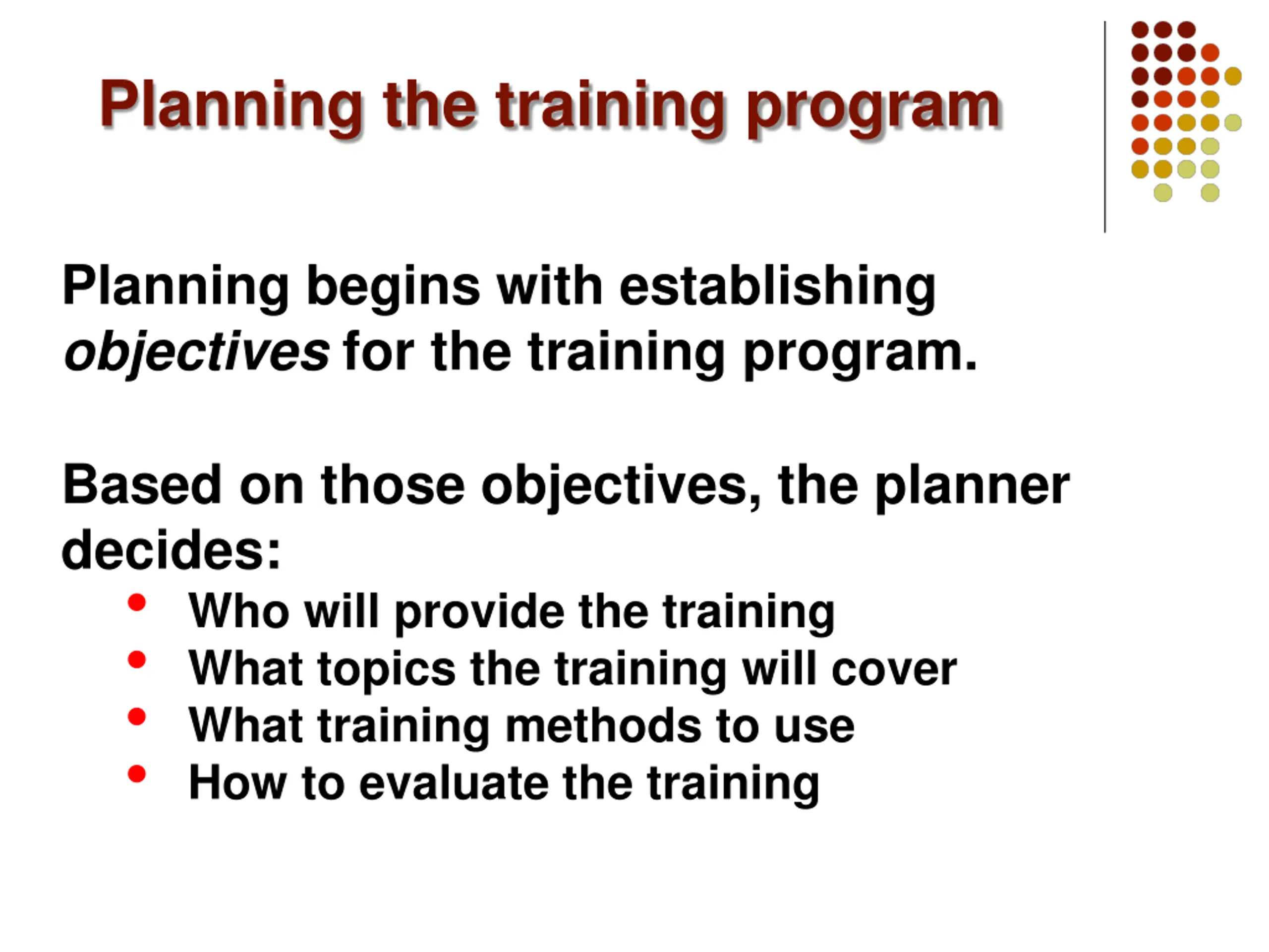 Planning the training program Planning begins with establishing objectives for the training program. Based on those objectives, the planner decides: Who will provide the training What topics the training will cover What training methods to use How to evaluate the training