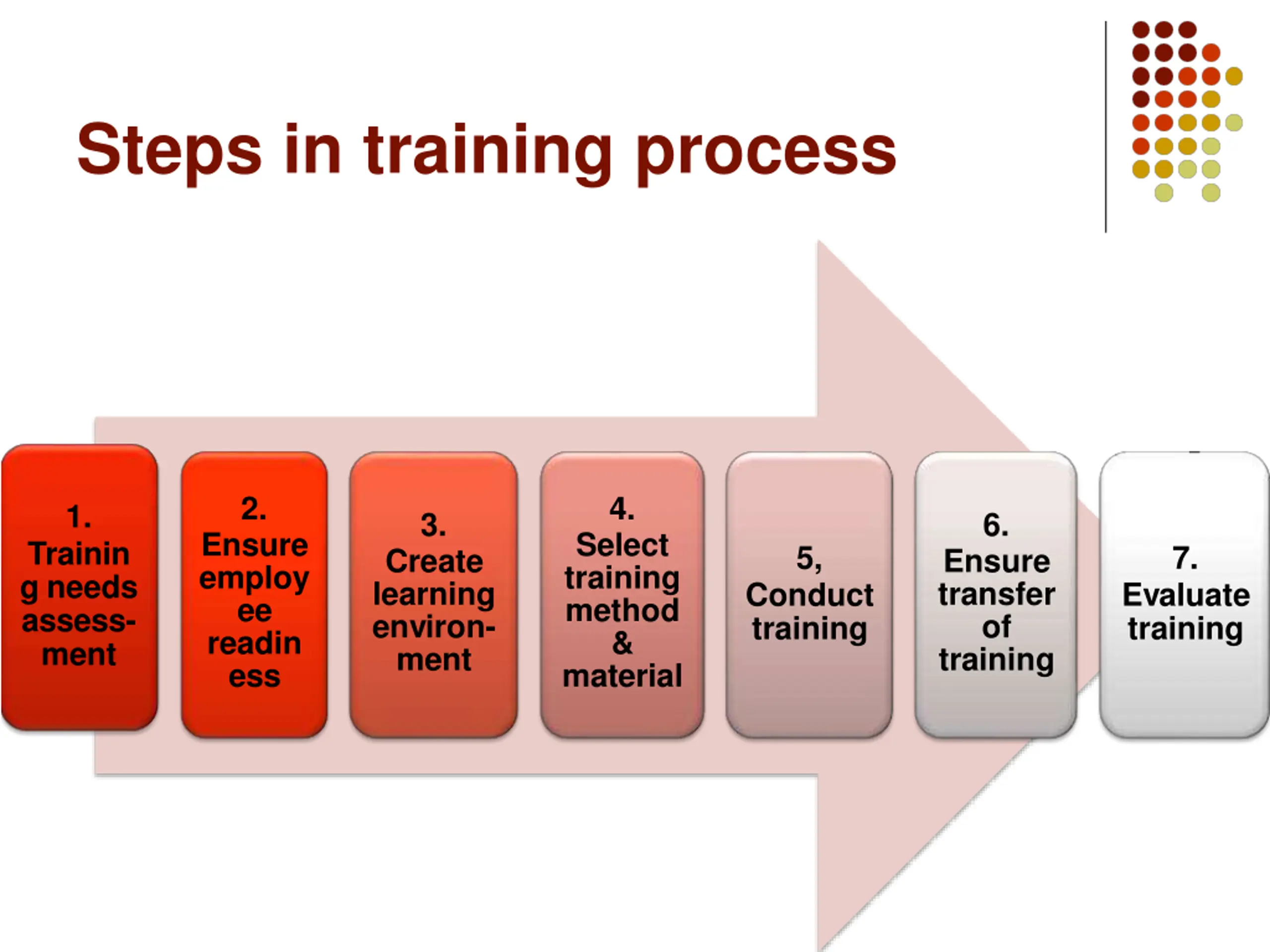Steps in training process 2. 4. 1. 3. 6. Ensure employ ee readin ess Select training method & material Trainin g needs assess- ment 5, 7. Create learning environ- ment Ensure transfer of training Conduct training Evaluate training
