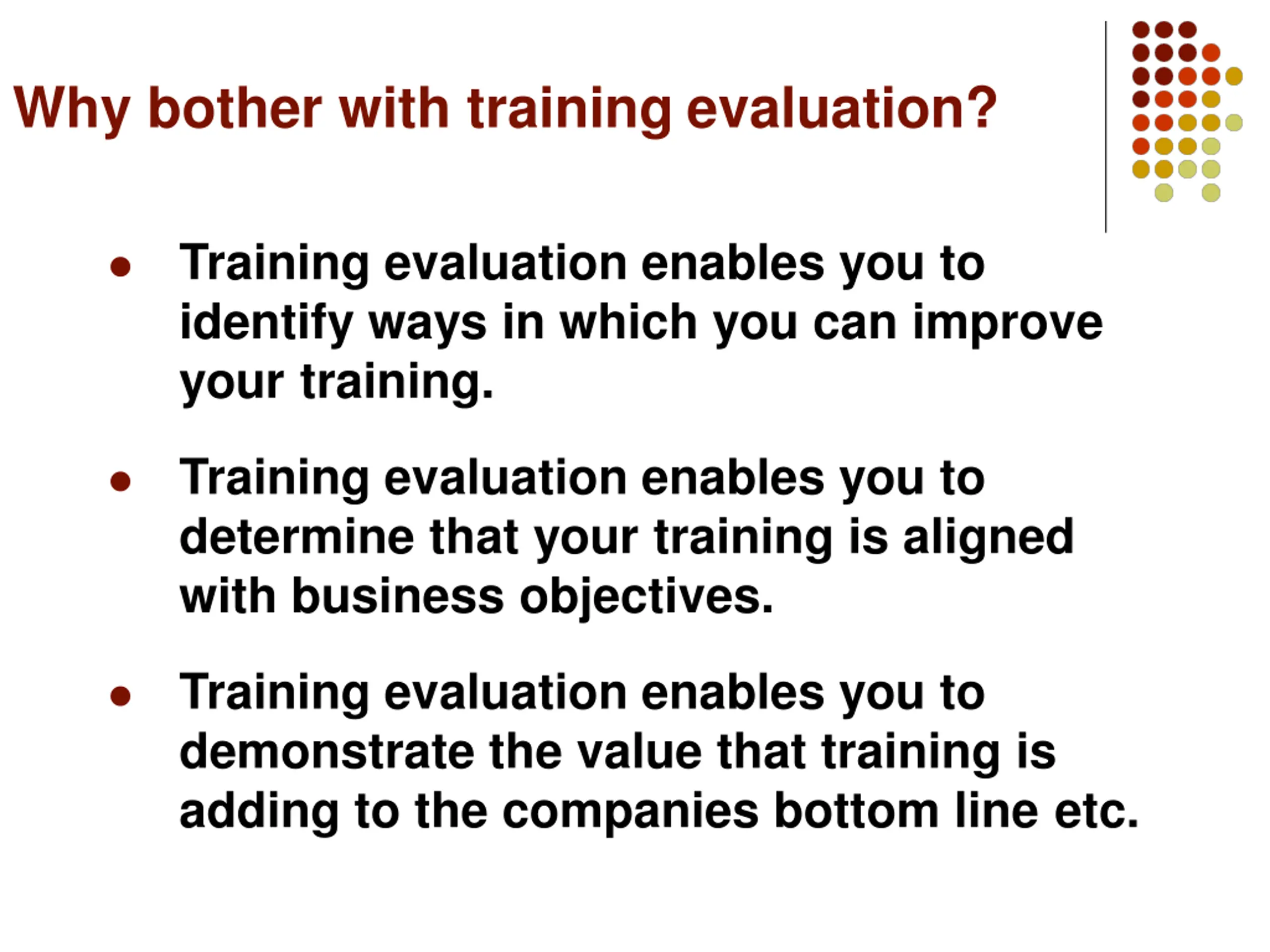 Why bother with training evaluation? Training evaluation enables you to identify ways in which you can improve your training. Training evaluation enables you to determine that your training is aligned with business objectives. Training evaluation enables you to demonstrate the value that training is adding to the companies bottom line etc.