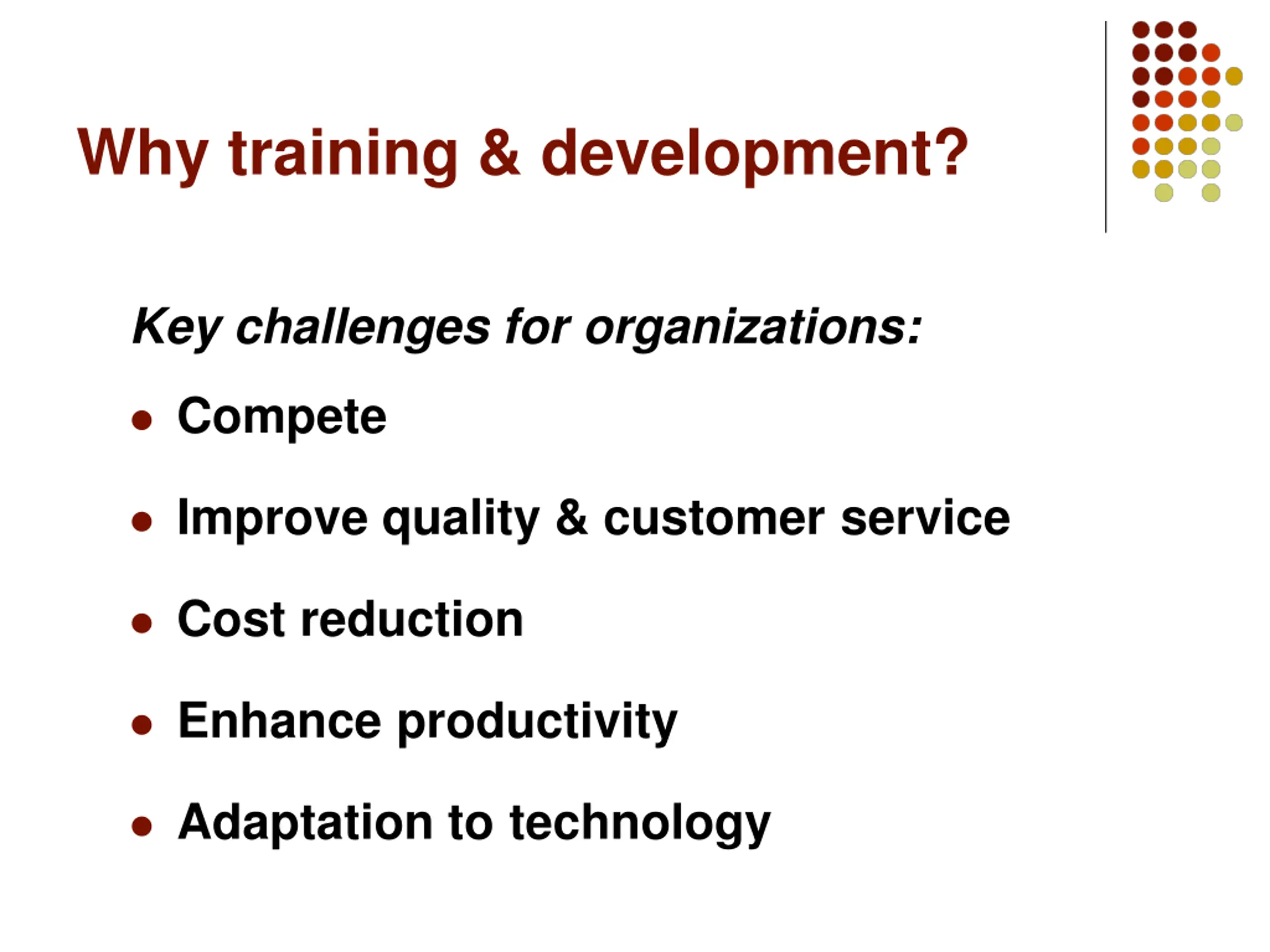 Why training & development? Key challenges for organizations: Compete Improve quality & customer service Cost reduction Enhance productivity Adaptation to technology