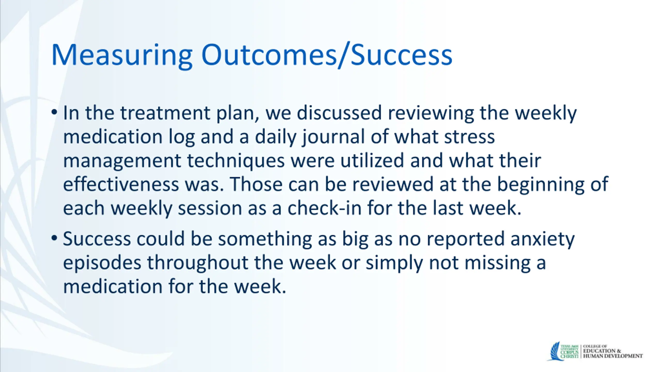 Measuring Outcomes/Success In the treatment plan, we discussed reviewing the weekly medication log and a daily journal of what stress management techniques were utilized and what their effectiveness was. Those can be reviewed at the beginning of each weekly session as a check-in for the last week. Success could be something as big as no reported anxiety episodes throughout the week or simply not missing a medication for the week.