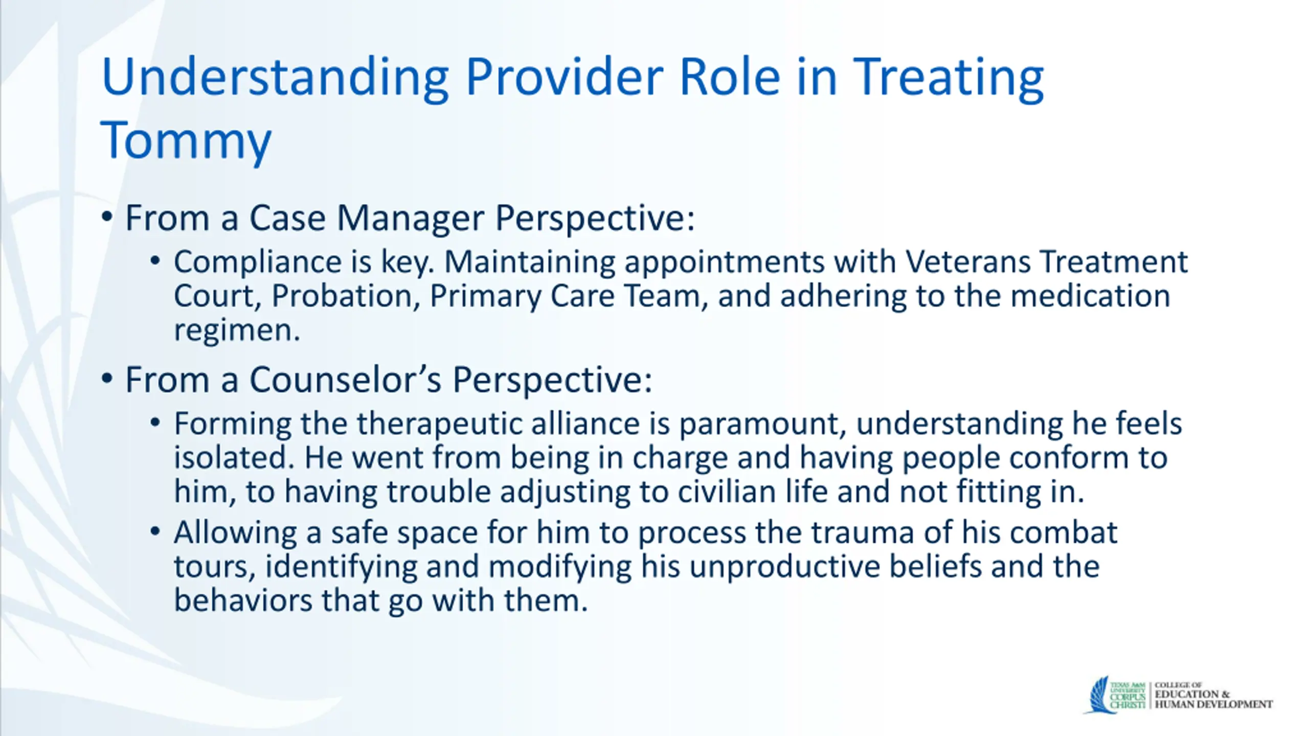 Understanding Provider Role in Treating Tommy From a Case Manager Perspective: Compliance is key. Maintaining appointments with Veterans Treatment Court, Probation, Primary Care Team, and adhering to the medication regimen. From a Counselor s Perspective: Forming the therapeutic alliance is paramount, understanding he feels isolated. He went from being in charge and having people conform to him, to having trouble adjusting to civilian life and not fitting in. Allowing a safe space for him to process the trauma of his combat tours, identifying and modifying his unproductive beliefs and the behaviors that go with them.
