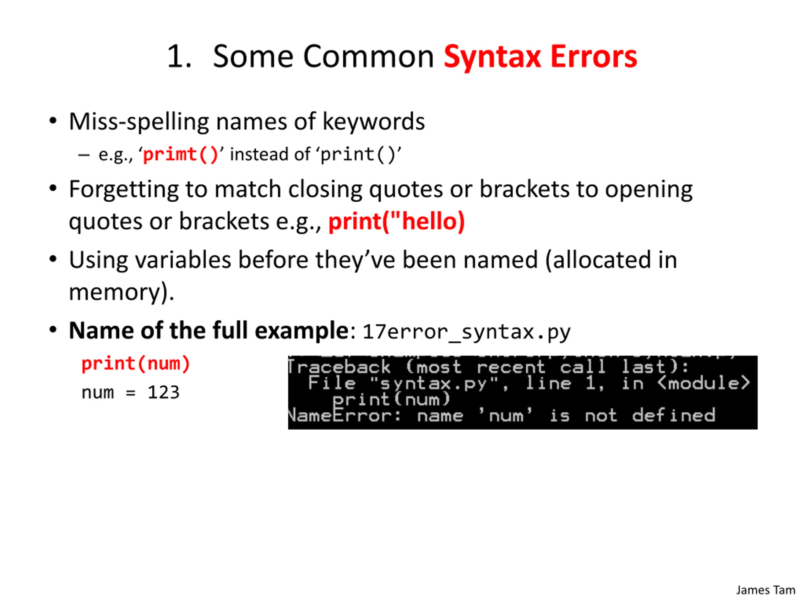 1. Some Common Syntax Errors Miss-spelling names of keywords e.g., primt() instead of print() Forgetting to match closing quotes or brackets to opening quotes or brackets e.g., print("hello) Using variables before they ve been named (allocated in memory). Name of the full example: 17error_syntax.py print(num) num = 123 James Tam