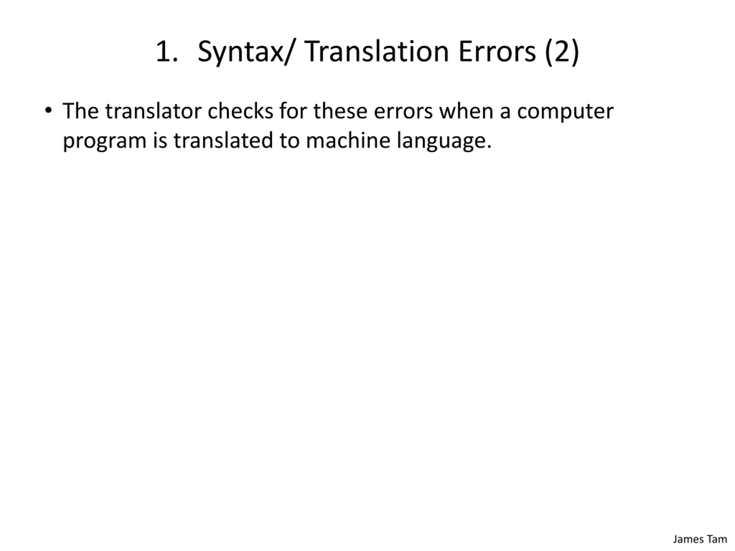 1. Syntax/ Translation Errors (2) The translator checks for these errors when a computer program is translated to machine language. James Tam