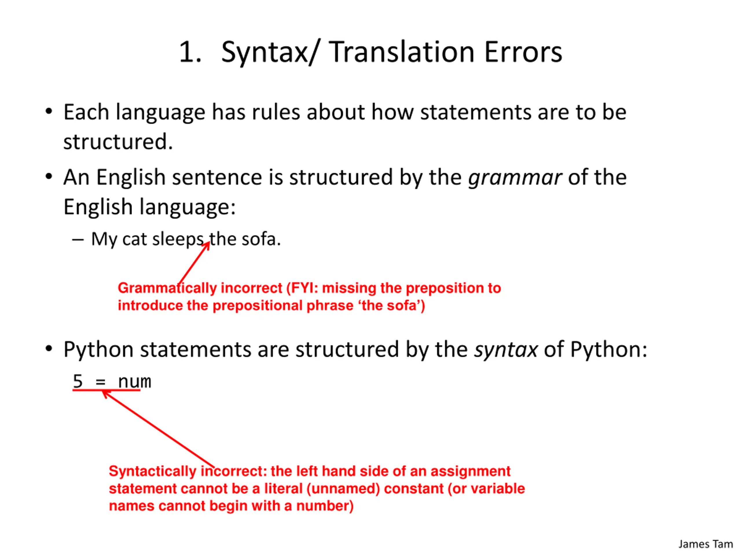 1. Syntax/ Translation Errors Each language has rules about how statements are to be structured. An English sentence is structured by the grammar of the English language: My cat sleeps the sofa. Grammatically incorrect (FYI: missing the preposition to introduce the prepositional phrase the sofa ) Python statements are structured by the syntax of Python: 5 = num Syntactically incorrect: the left hand side of an assignment statement cannot be a literal (unnamed) constant (or variable names cannot begin with a number) James Tam