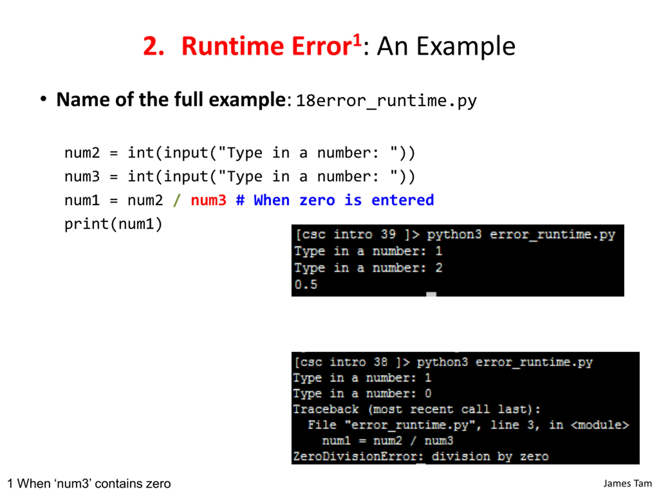 2. Runtime Error1: An Example Name of the full example:18error_runtime.py num2 = int(input("Type in a number: ")) num3 = int(input("Type in a number: ")) num1 = num2 / num3 # When zero is entered print(num1) 1 When num3 contains zero James Tam