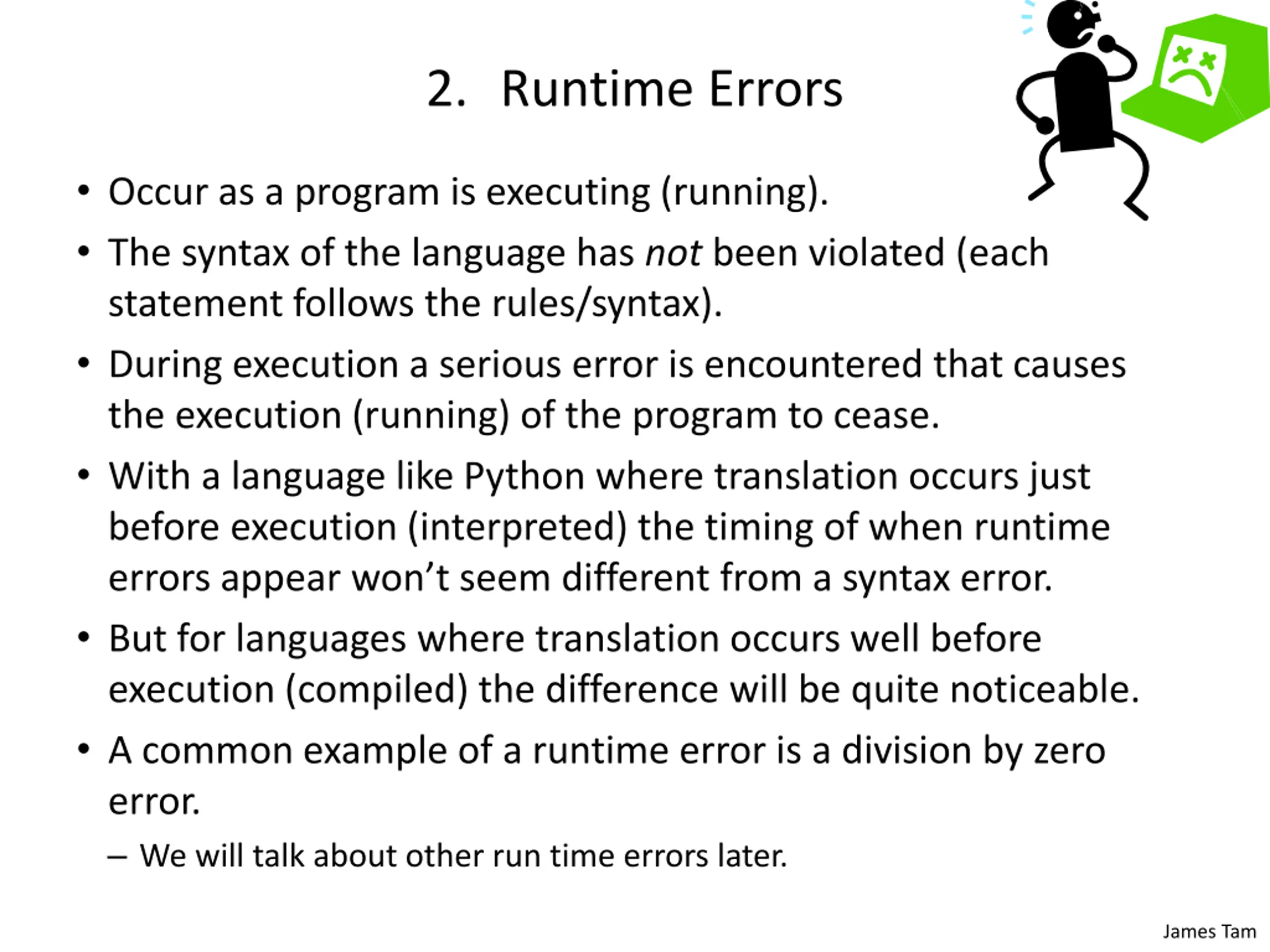 2. Runtime Errors Occur as a program is executing (running). The syntax of the language has not been violated (each statement follows the rules/syntax). During execution a serious error is encountered that causes the execution (running) of the program to cease. With a language like Python where translation occurs just before execution (interpreted) the timing of when runtime errors appear won t seem different from a syntax error. But for languages where translation occurs well before execution (compiled) the difference will be quite noticeable. A common example of a runtime error is a division by zero error. We will talk about other run time errors later. James Tam