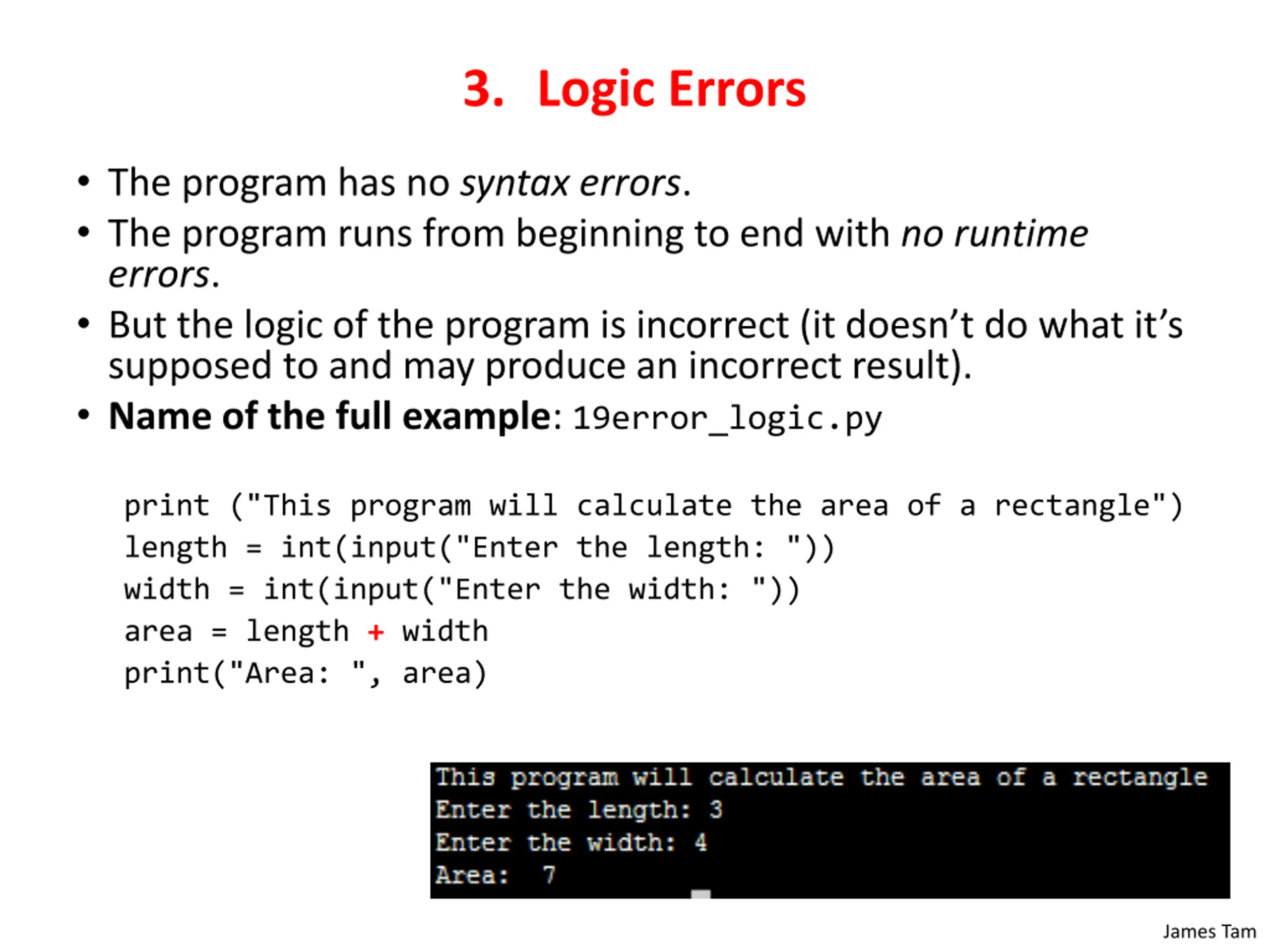 3. Logic Errors The program has no syntax errors. The program runs from beginning to end with no runtime errors. But the logic of the program is incorrect (it doesn t do what it s supposed to and may produce an incorrect result). Name of the full example: 19error_logic.py print ("This program will calculate the area of a rectangle") length = int(input("Enter the length: ")) width = int(input("Enter the width: ")) area = length + width print("Area: ", area) James Tam