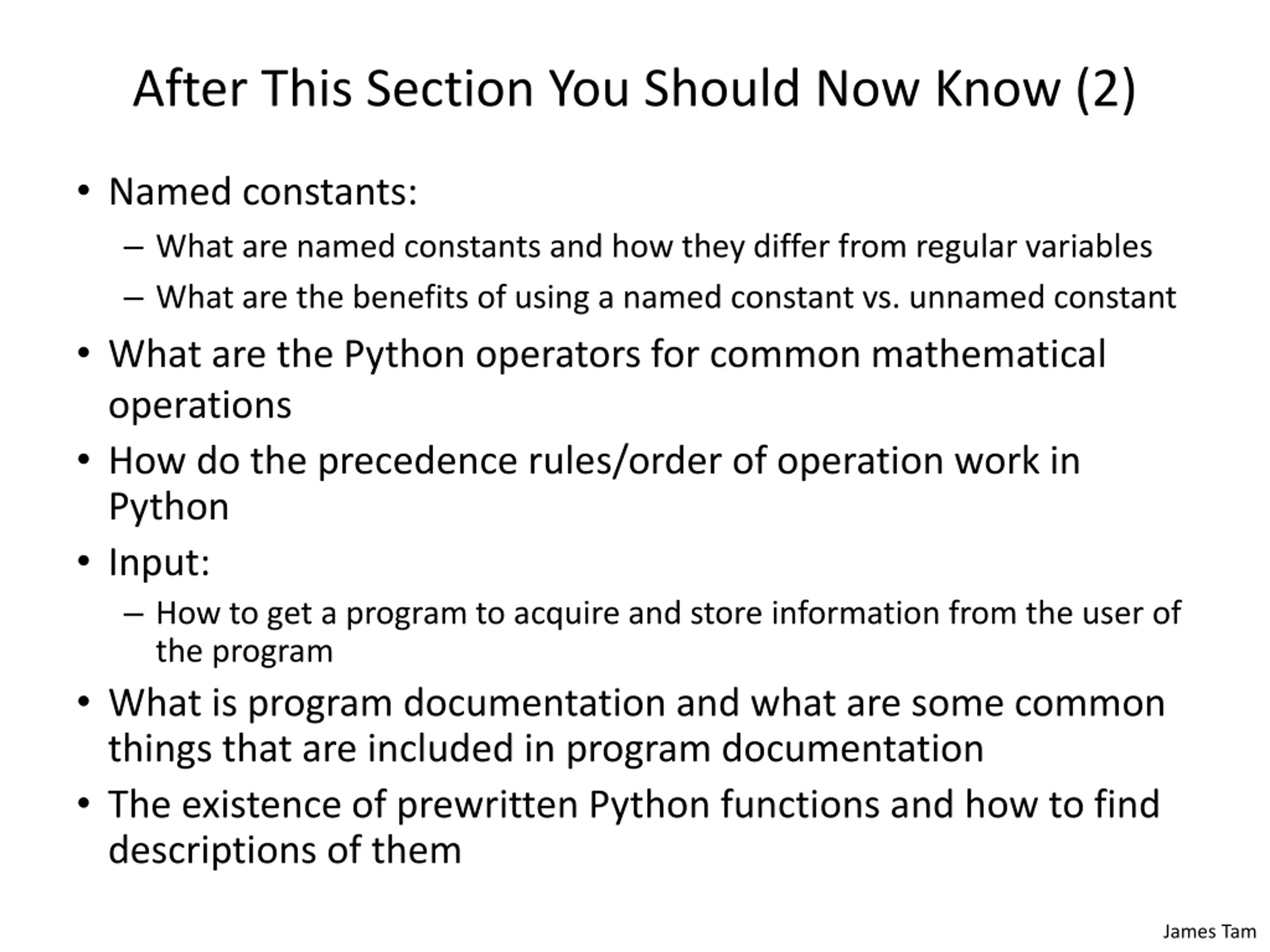 After This Section You Should Now Know (2) Named constants: What are named constants and how they differ from regular variables What are the benefits of using a named constant vs. unnamed constant What are the Python operators for common mathematical operations How do the precedence rules/order of operation work in Python Input: How to get a program to acquire and store information from the user of the program What is program documentation and what are some common things that are included in program documentation The existence of prewritten Python functions and how to find descriptions of them James Tam