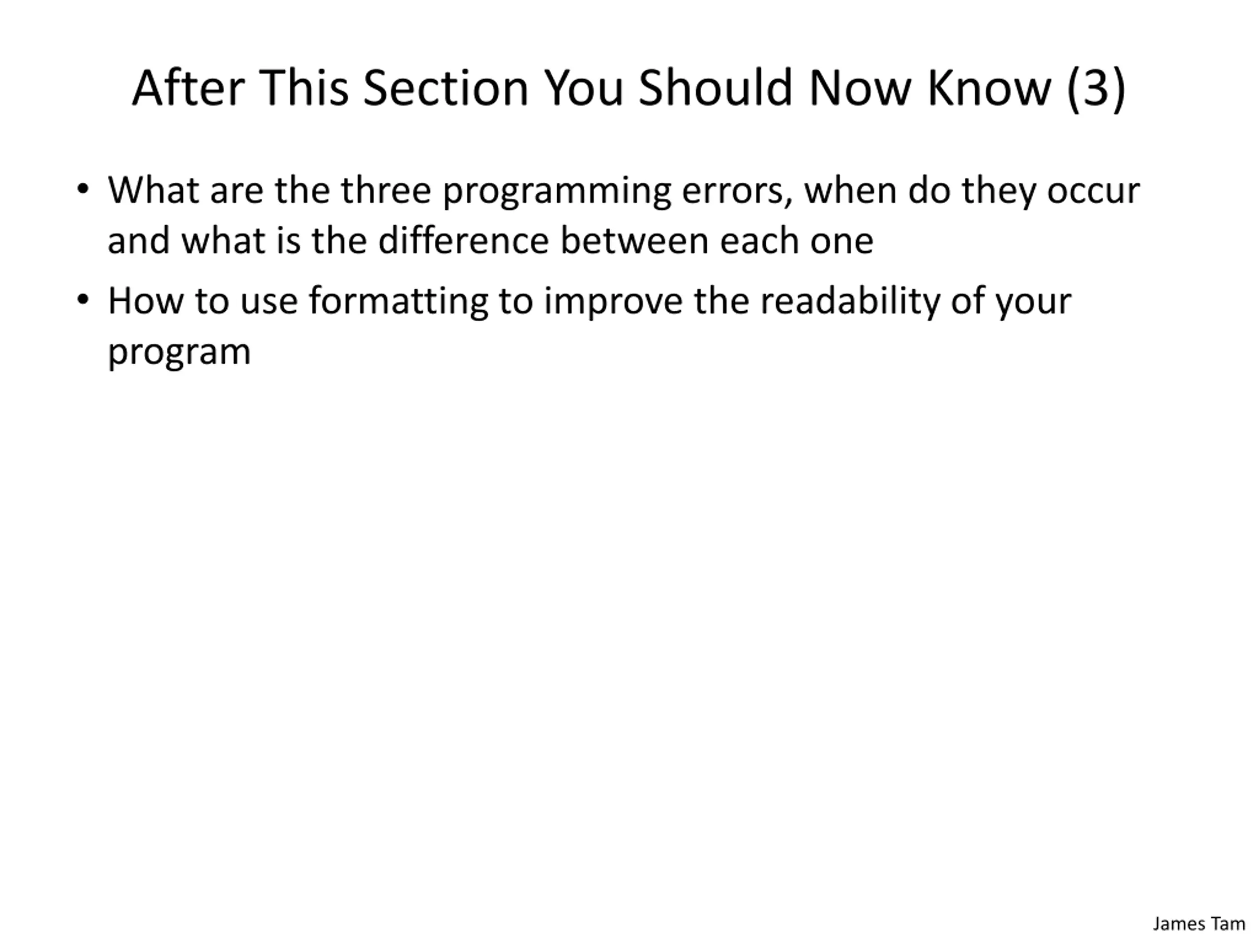 After This Section You Should Now Know (3) What are the three programming errors, when do they occur and what is the difference between each one How to use formatting to improve the readability of your program James Tam
