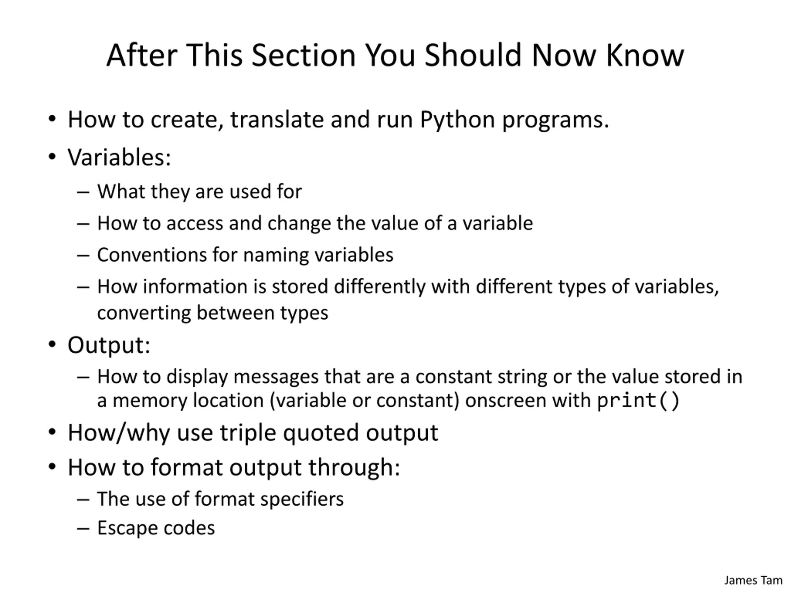 After This Section You Should Now Know How to create, translate and run Python programs. Variables: What they are used for How to access and change the value of a variable Conventions for naming variables How information is stored differently with different types of variables, converting between types Output: How to display messages that are a constant string or the value stored in a memory location (variable or constant) onscreen with print() How/why use triple quoted output How to format output through: The use of format specifiers Escape codes James Tam