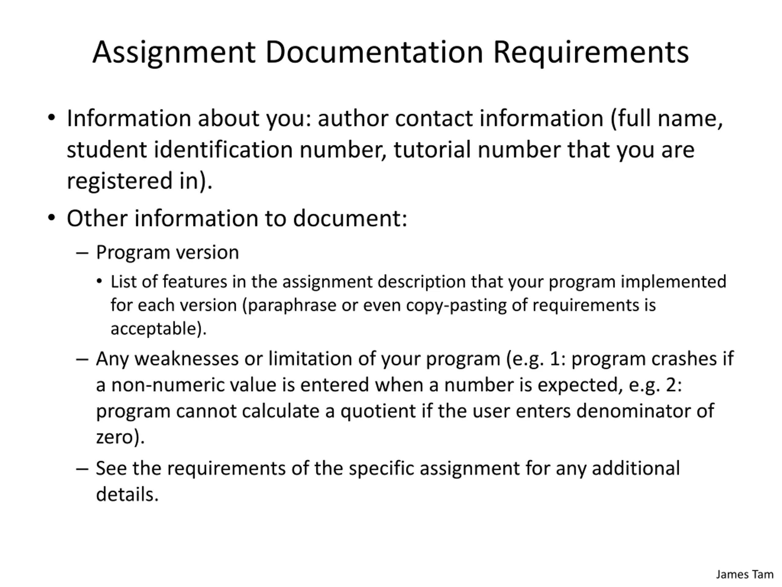 Assignment Documentation Requirements Information about you: author contact information (full name, student identification number, tutorial number that you are registered in). Other information to document: Program version List of features in the assignment description that your program implemented for each version (paraphrase or even copy-pasting of requirements is acceptable). Any weaknesses or limitation of your program (e.g. 1: program crashes if a non-numeric value is entered when a number is expected, e.g. 2: program cannot calculate a quotient if the user enters denominator of zero). See the requirements of the specific assignment for any additional details. James Tam