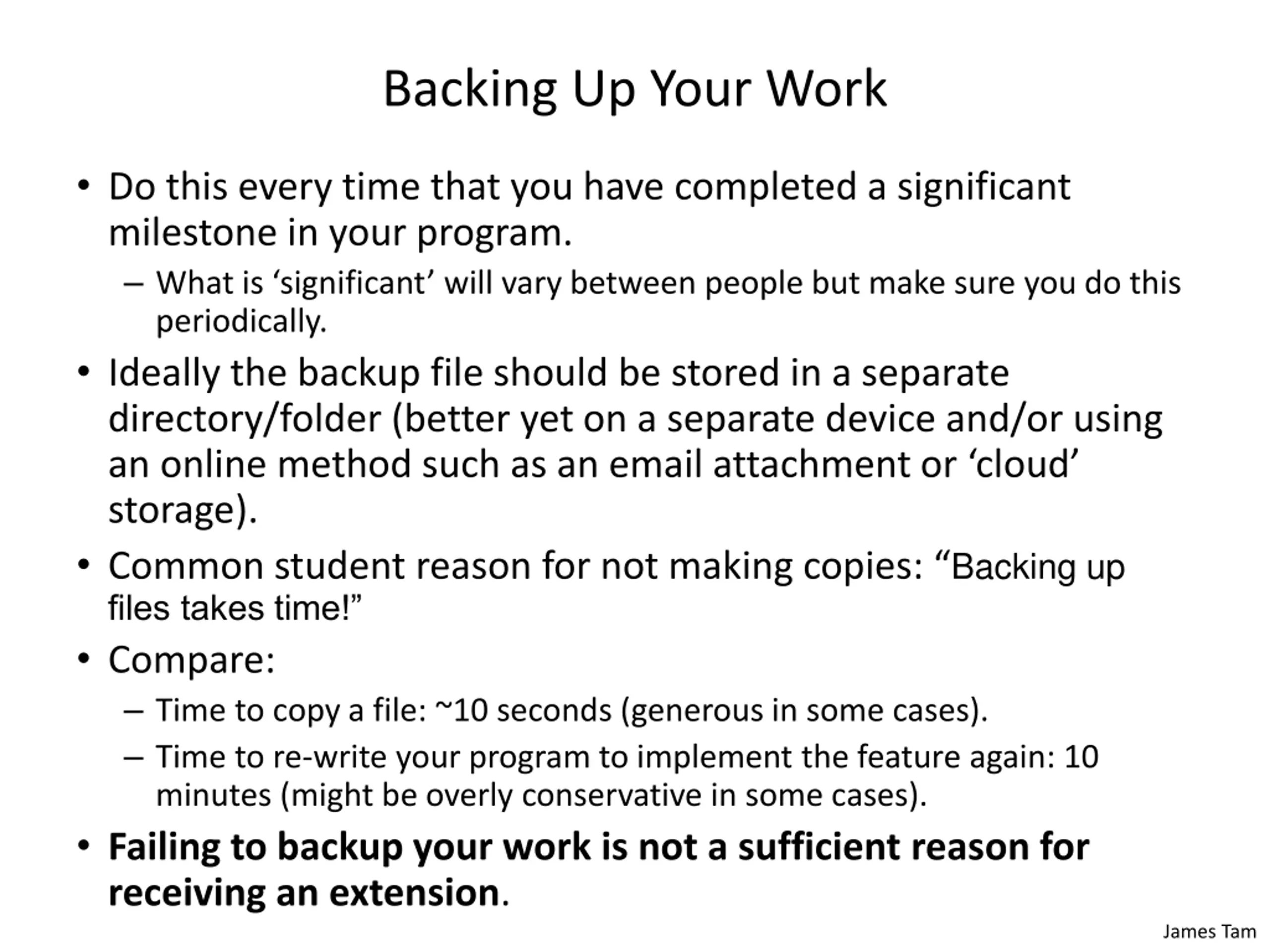 Backing Up Your Work Do this every time that you have completed a significant milestone in your program. What is significant will vary between people but make sure you do this periodically. Ideally the backup file should be stored in a separate directory/folder (better yet on a separate device and/or using an online method such as an email attachment or cloud storage). Common student reason for not making copies: Backing up files takes time! Compare: Time to copy a file: ~10 seconds (generous in some cases). Time to re-write your program to implement the feature again: 10 minutes (might be overly conservative in some cases). Failing to backup your work is not a sufficient reason for receiving an extension. James Tam