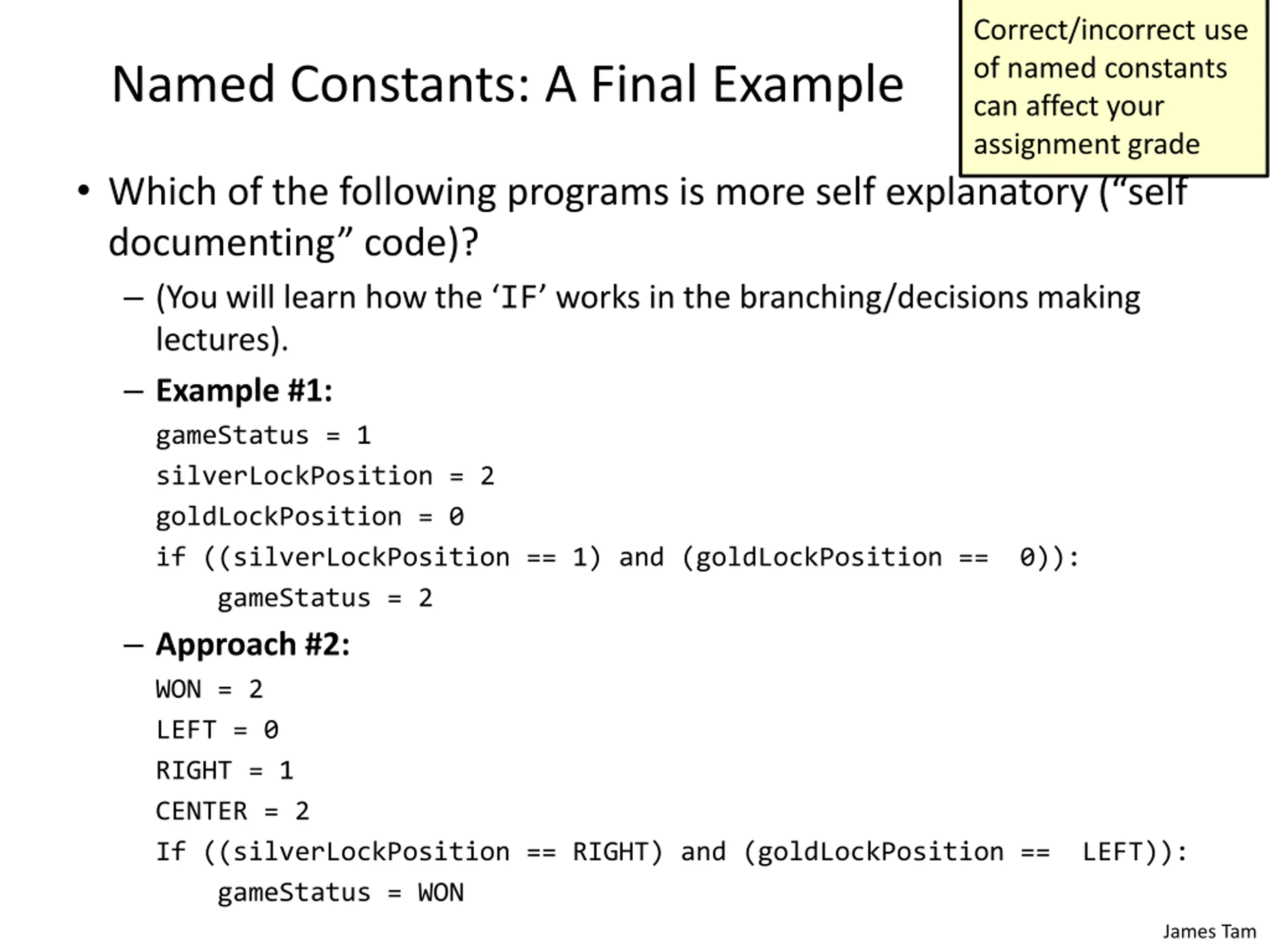 Correct/incorrect use of named constants can affect your assignment grade Named Constants: A Final Example Which of the following programs is more self explanatory ( self documenting code)? (You will learn how the IF works in the branching/decisions making lectures). Example #1: gameStatus = 1 silverLockPosition = 2 goldLockPosition = 0 if ((silverLockPosition == 1) and (goldLockPosition == 0)): gameStatus = 2 Approach #2: WON = 2 LEFT = 0 RIGHT = 1 CENTER = 2 If ((silverLockPosition == RIGHT) and (goldLockPosition == LEFT)): gameStatus = WON James Tam