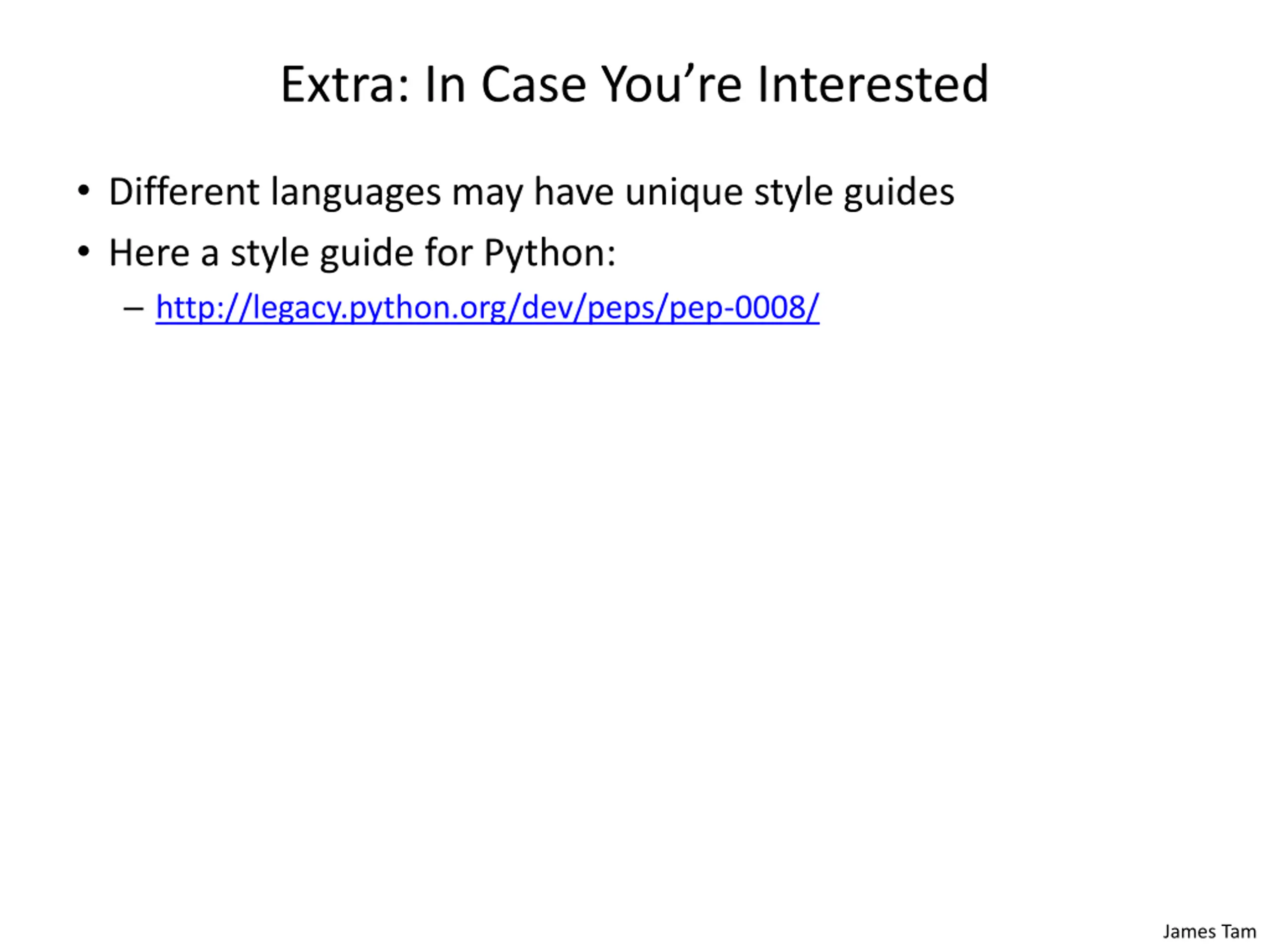 Extra: In Case Youre Interested Different languages may have unique style guides Here a style guide for Python: http://legacy.python.org/dev/peps/pep-0008/ James Tam