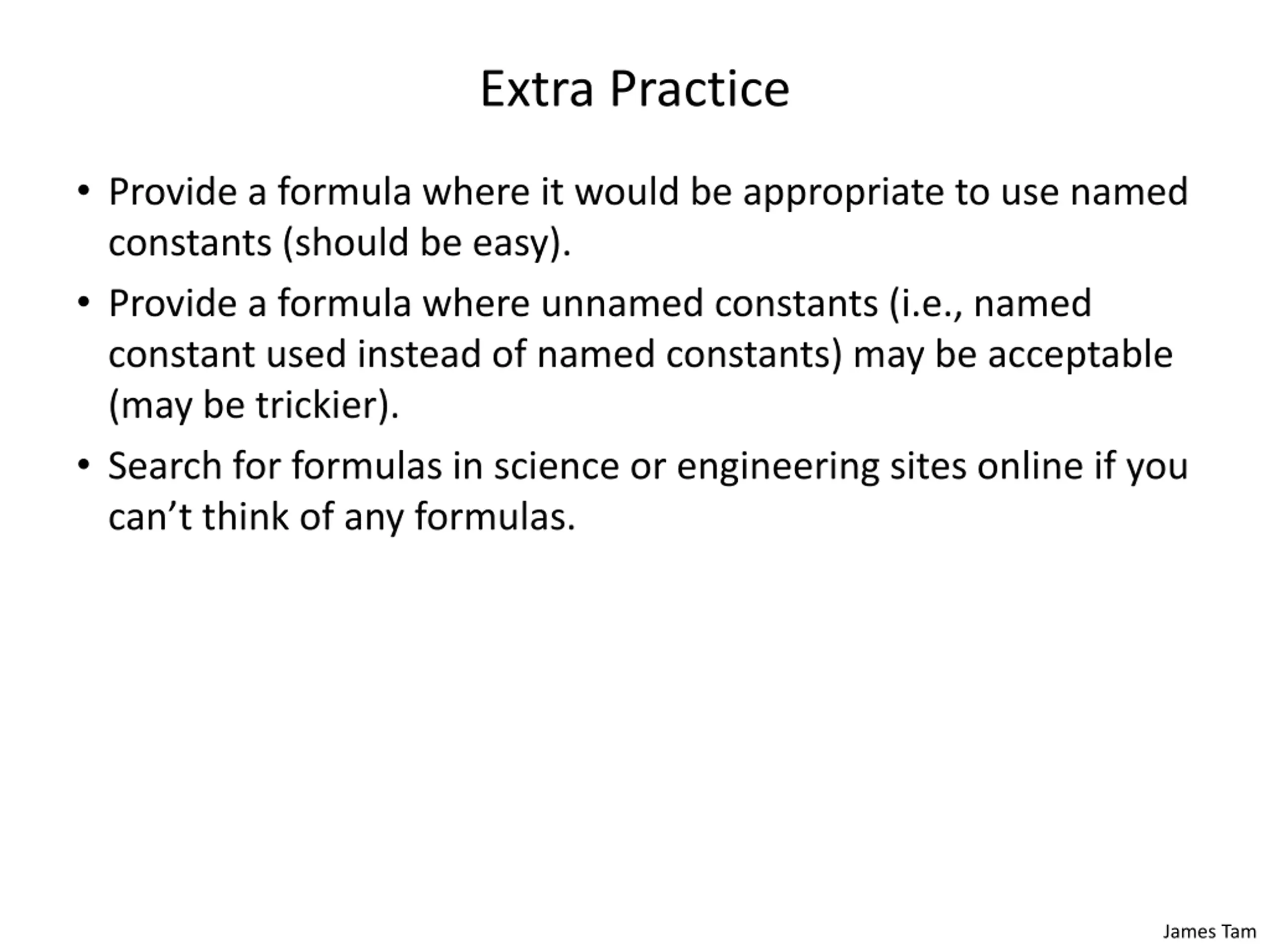 Extra Practice Provide a formula where it would be appropriate to use named constants (should be easy). Provide a formula where unnamed constants (i.e., named constant used instead of named constants) may be acceptable (may be trickier). Search for formulas in science or engineering sites online if you can t think of any formulas. James Tam