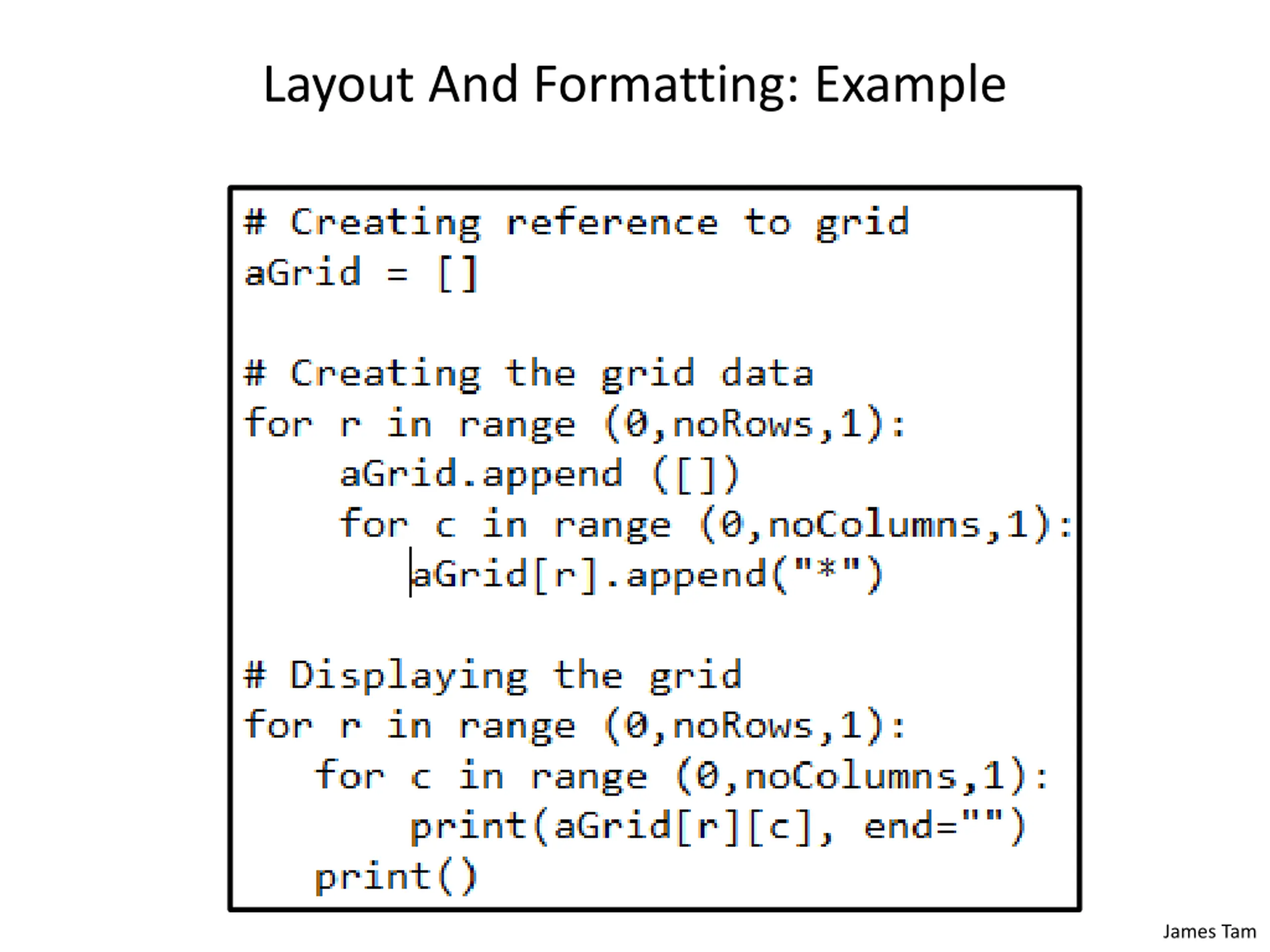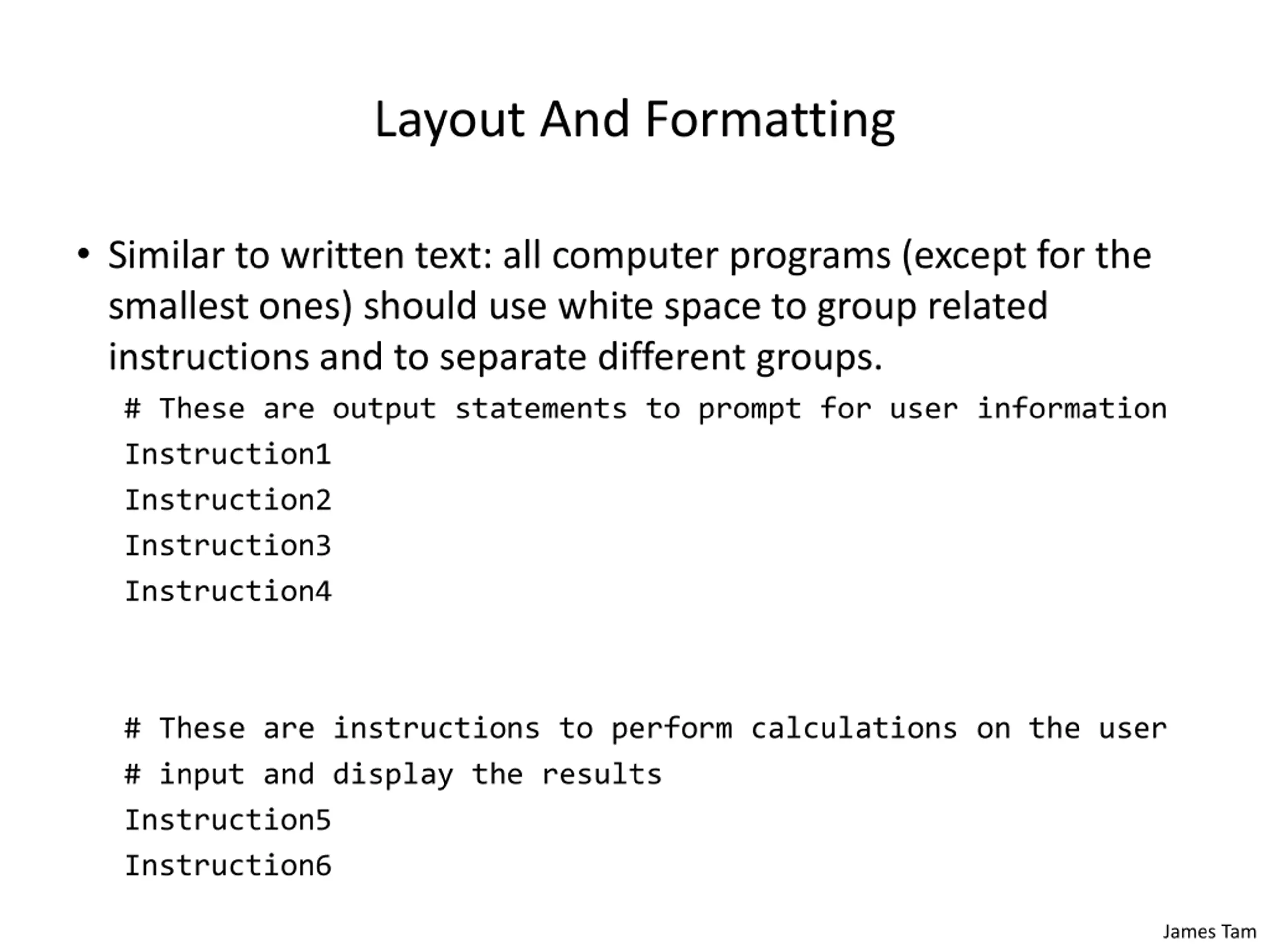 Layout And Formatting Similar to written text: all computer programs (except for the smallest ones) should use white space to group related instructions and to separate different groups. # These are output statements to prompt for user information Instruction1 Instruction2 Instruction3 Instruction4 # These are instructions to perform calculations on the user # input and display the results Instruction5 Instruction6 James Tam