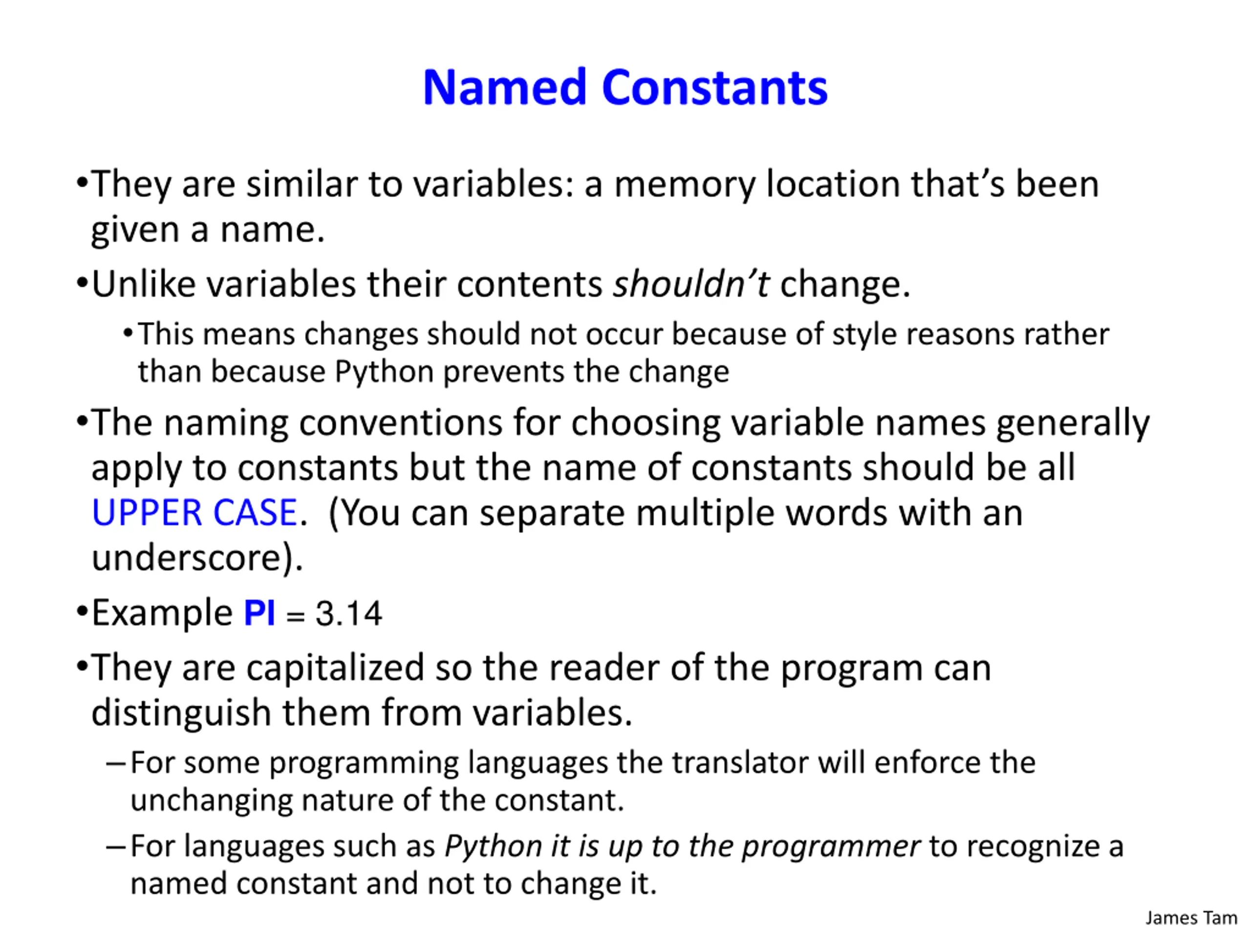 Named Constants They are similar to variables: a memory location that s been given a name. Unlike variables their contents shouldn t change. This means changes should not occur because of style reasons rather than because Python prevents the change The naming conventions for choosing variable names generally apply to constants but the name of constants should be all UPPER CASE. (You can separate multiple words with an underscore). Example PI = 3.14 They are capitalized so the reader of the program can distinguish them from variables. For some programming languages the translator will enforce the unchanging nature of the constant. For languages such as Python it is up to the programmer to recognize a named constant and not to change it. James Tam