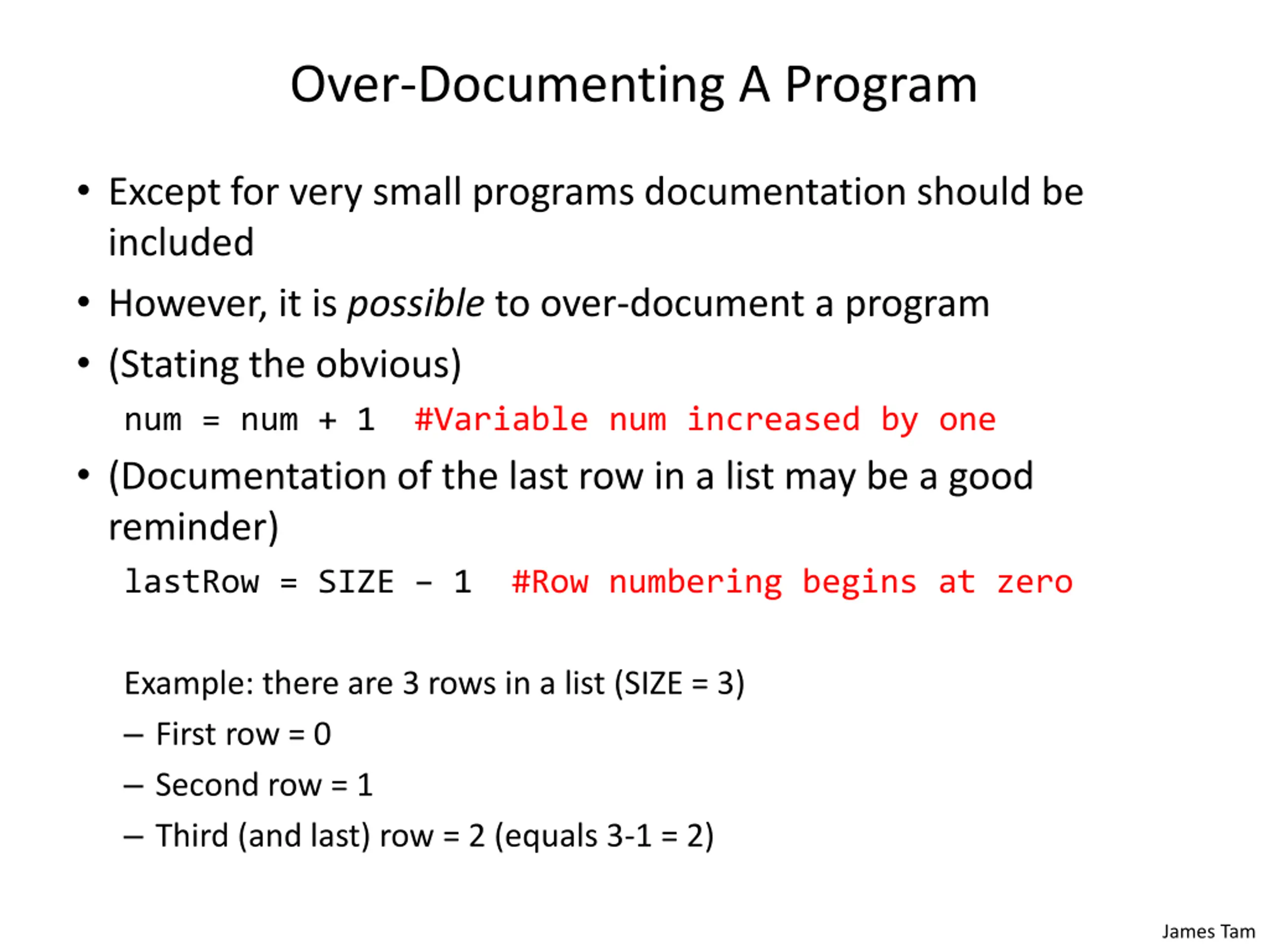 Over-Documenting A Program Except for very small programs documentation should be included However, it is possible to over-document a program (Stating the obvious) num = num + 1 #Variable num increased by one (Documentation of the last row in a list may be a good reminder) lastRow = SIZE 1 #Row numbering begins at zero Example: there are 3 rows in a list (SIZE = 3) First row = 0 Second row = 1 Third (and last) row = 2 (equals 3-1 = 2) James Tam