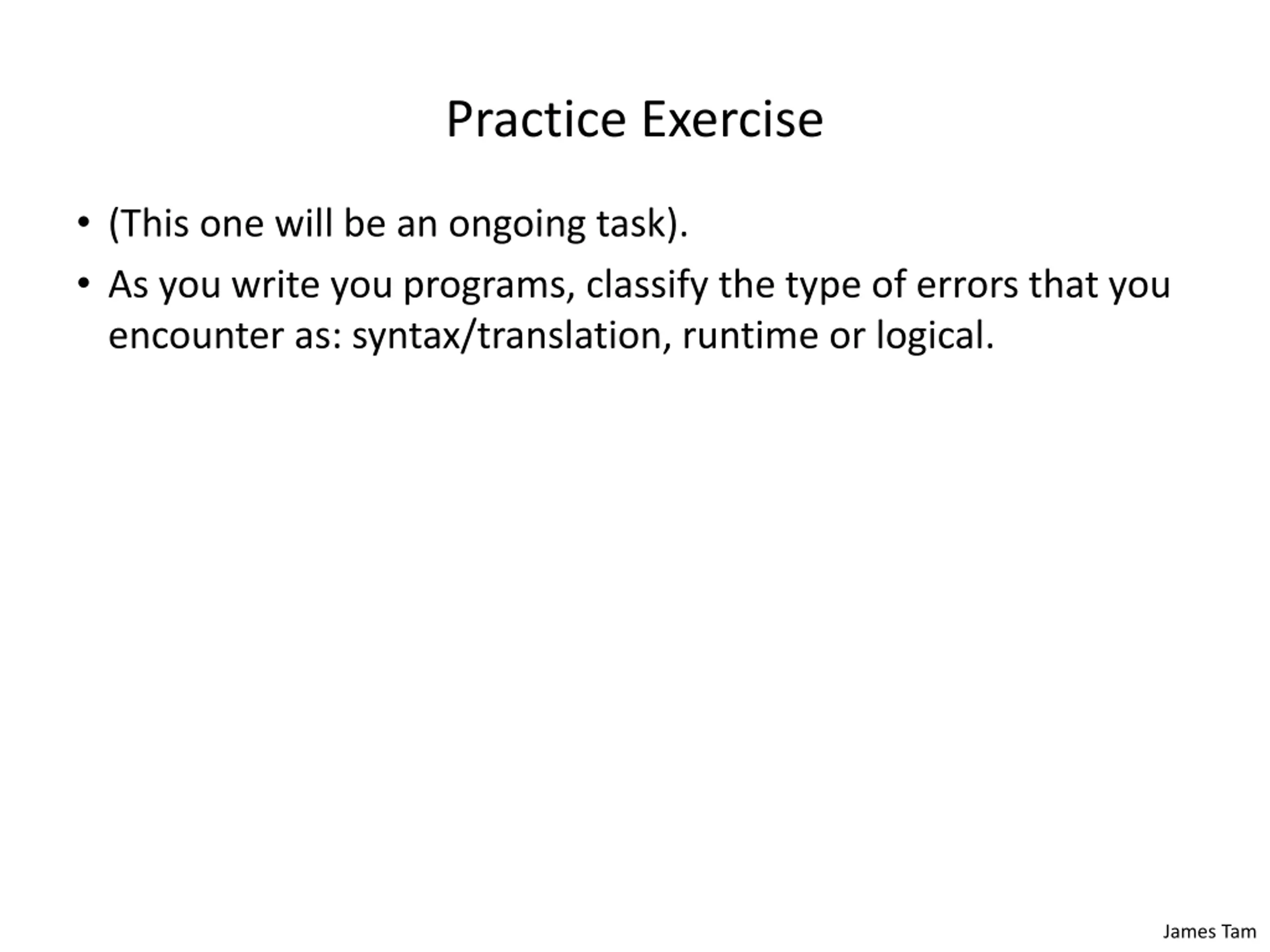 Practice Exercise (This one will be an ongoing task). As you write you programs, classify the type of errors that you encounter as: syntax/translation, runtime or logical. James Tam