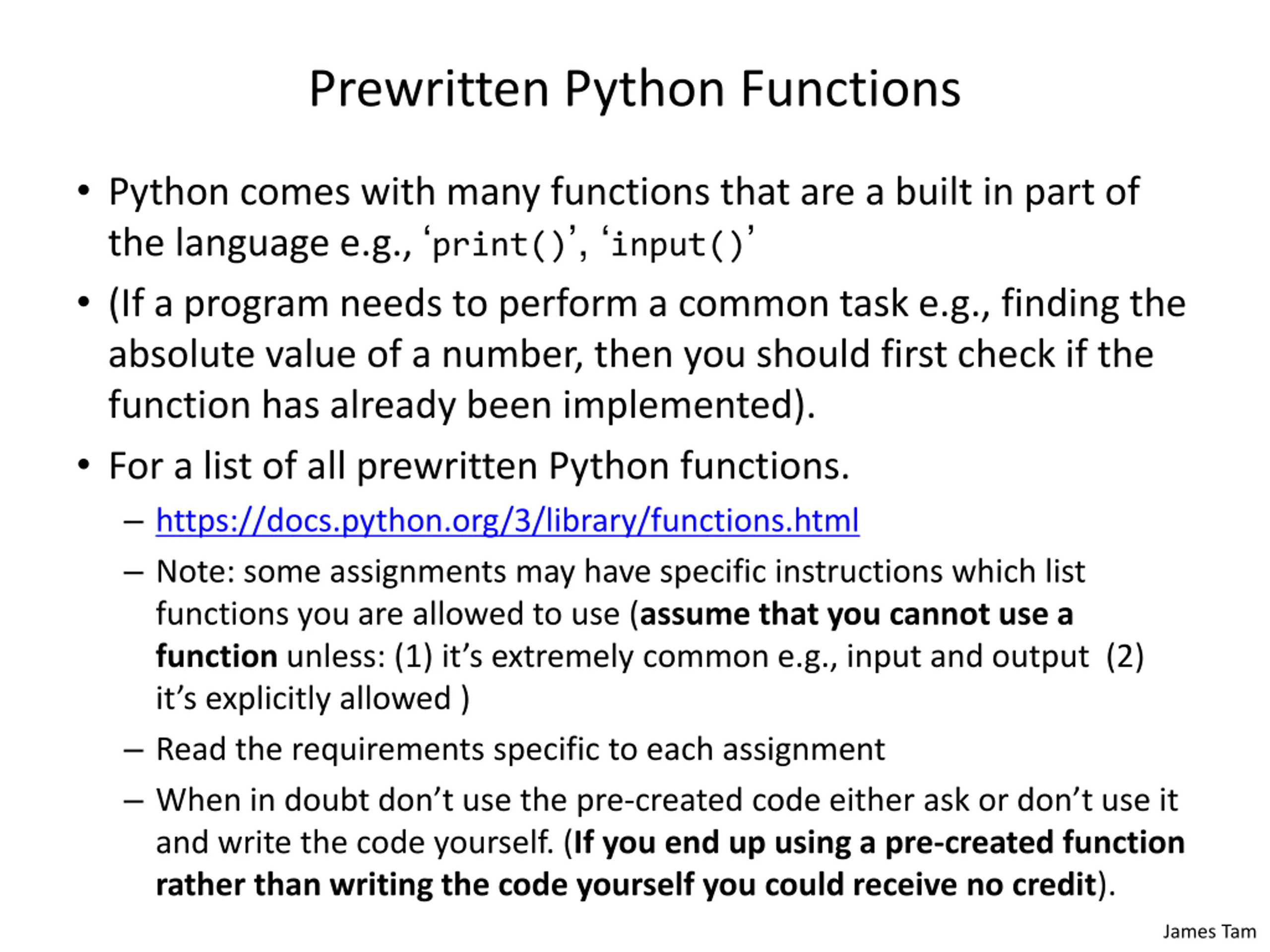 Prewritten Python Functions Python comes with many functions that are a built in part of the language e.g., print() , input() (If a program needs to perform a common task e.g., finding the absolute value of a number, then you should first check if the function has already been implemented). For a list of all prewritten Python functions. https://docs.python.org/3/library/functions.html Note: some assignments may have specific instructions which list functions you are allowed to use (assume that you cannot use a function unless: (1) it s extremely common e.g., input and output (2) it s explicitly allowed ) Read the requirements specific to each assignment When in doubt don t use the pre-created code either ask or don t use it and write the code yourself. (If you end up using a pre-created function rather than writing the code yourself you could receive no credit). James Tam