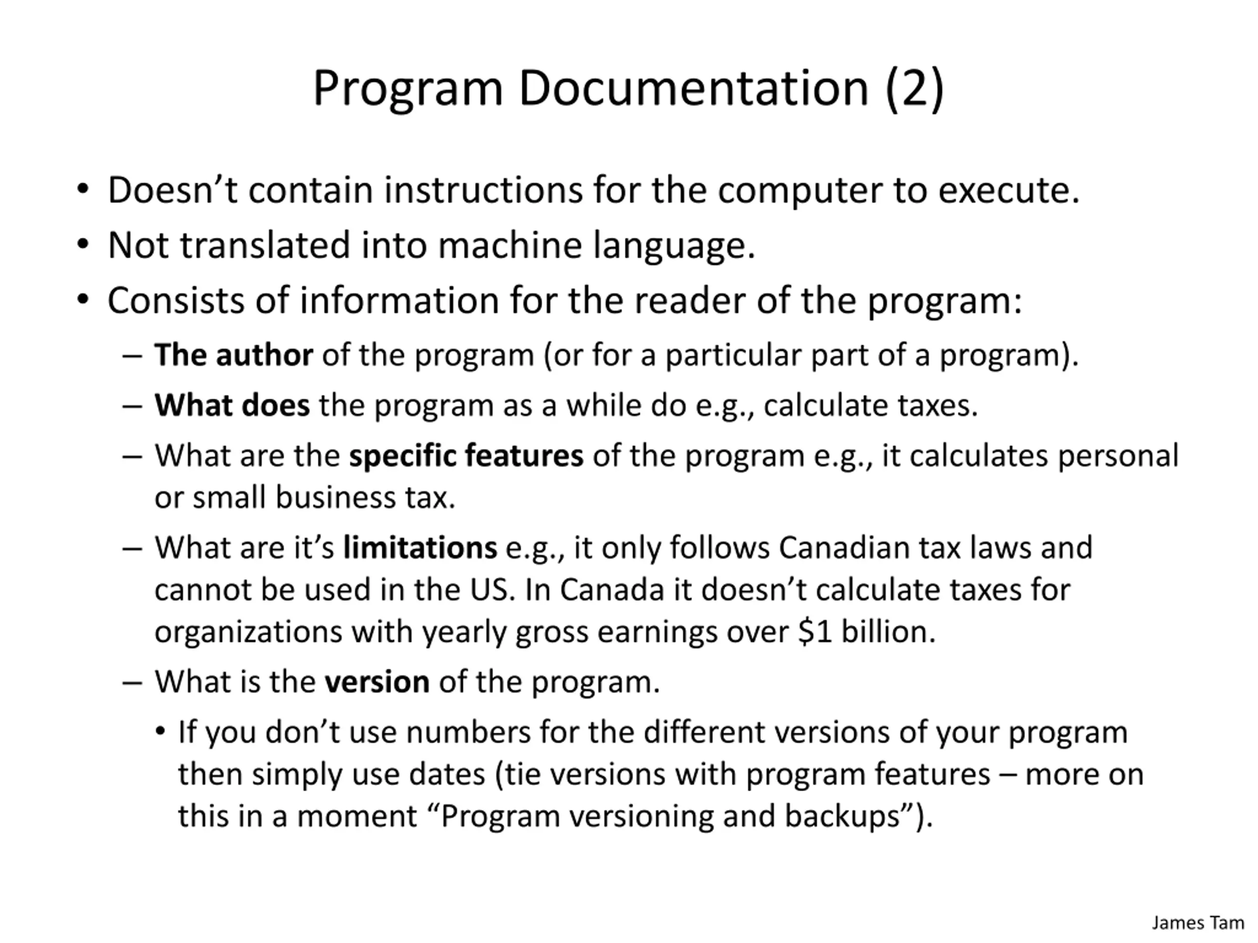Program Documentation (2) Doesn t contain instructions for the computer to execute. Not translated into machine language. Consists of information for the reader of the program: The author of the program (or for a particular part of a program). What does the program as a while do e.g., calculate taxes. What are the specific features of the program e.g., it calculates personal or small business tax. What are it s limitations e.g., it only follows Canadian tax laws and cannot be used in the US. In Canada it doesn t calculate taxes for organizations with yearly gross earnings over $1 billion. What is the version of the program. If you don t use numbers for the different versions of your program then simply use dates (tie versions with program features more on this in a moment Program versioning and backups ). James Tam