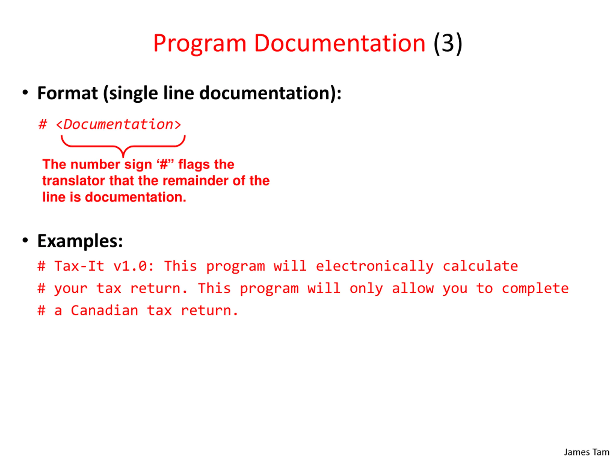 Program Documentation (3) Format (single line documentation): # <Documentation> The number sign # flags the translator that the remainder of the line is documentation. Examples: # Tax-It v1.0: This program will electronically calculate # your tax return. This program will only allow you to complete # a Canadian tax return. James Tam