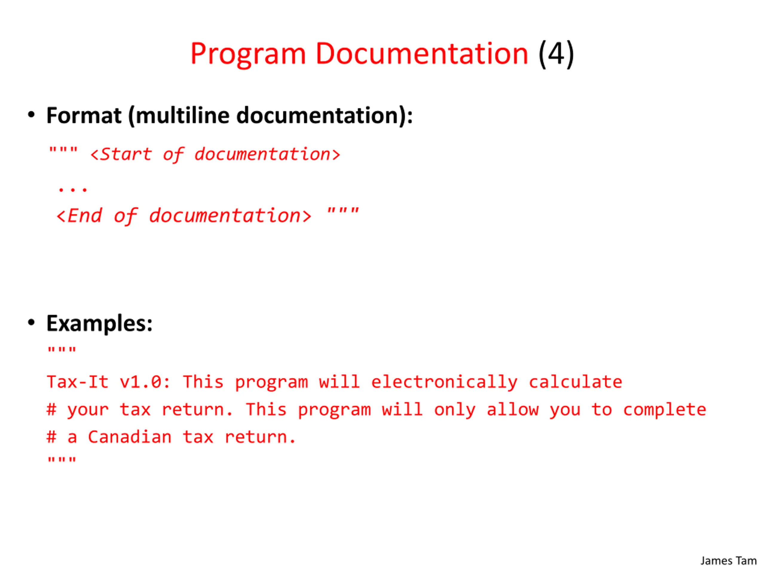 Program Documentation (4) Format (multiline documentation): """ <Start of documentation> ... <End of documentation> """ Examples: """ Tax-It v1.0: This program will electronically calculate # your tax return. This program will only allow you to complete # a Canadian tax return. """ James Tam