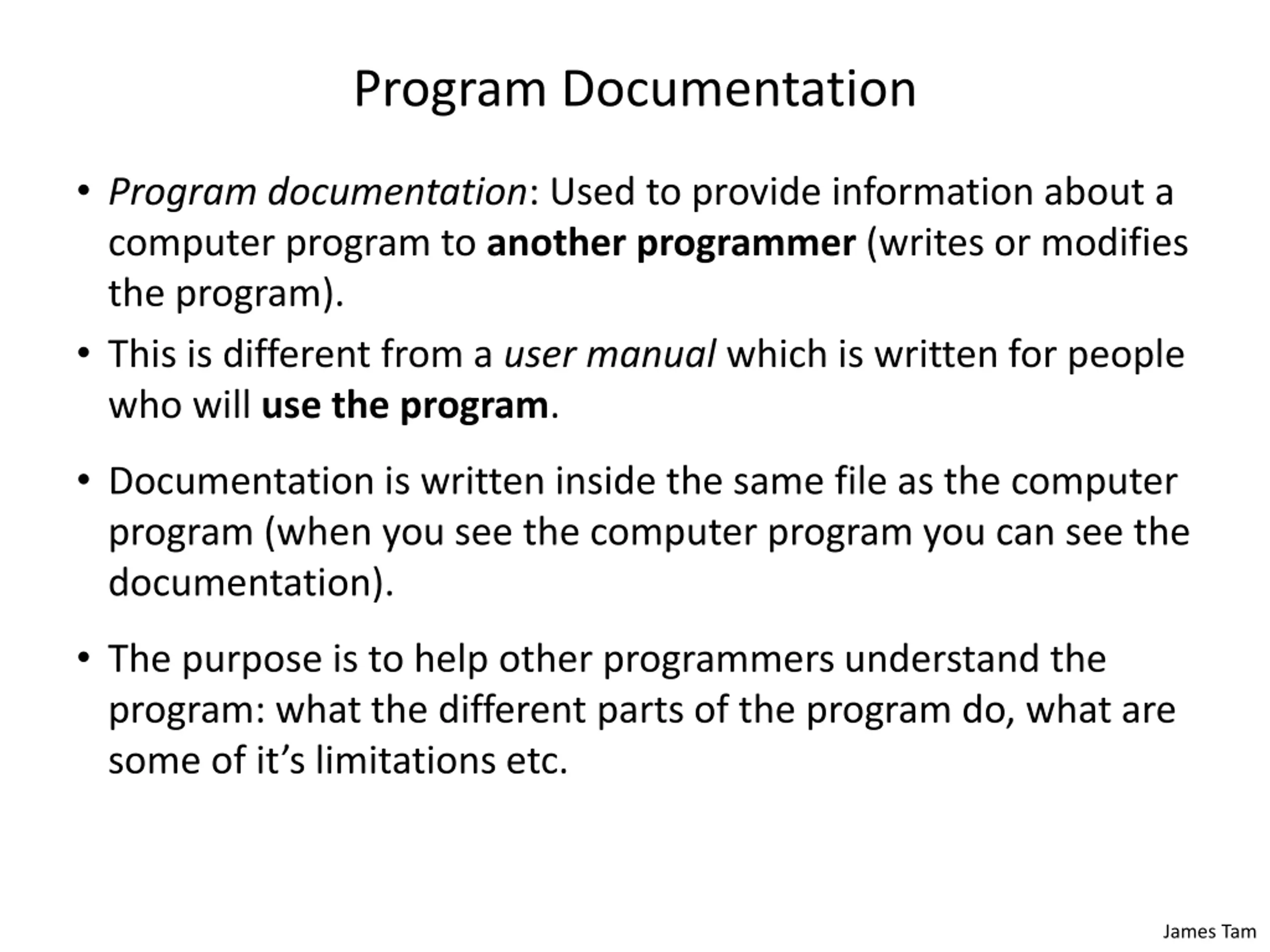 Program Documentation Program documentation: Used to provide information about a computer program to another programmer (writes or modifies the program). This is different from a user manual which is written for people who will use the program. Documentation is written inside the same file as the computer program (when you see the computer program you can see the documentation). The purpose is to help other programmers understand the program: what the different parts of the program do, what are some of it s limitations etc. James Tam