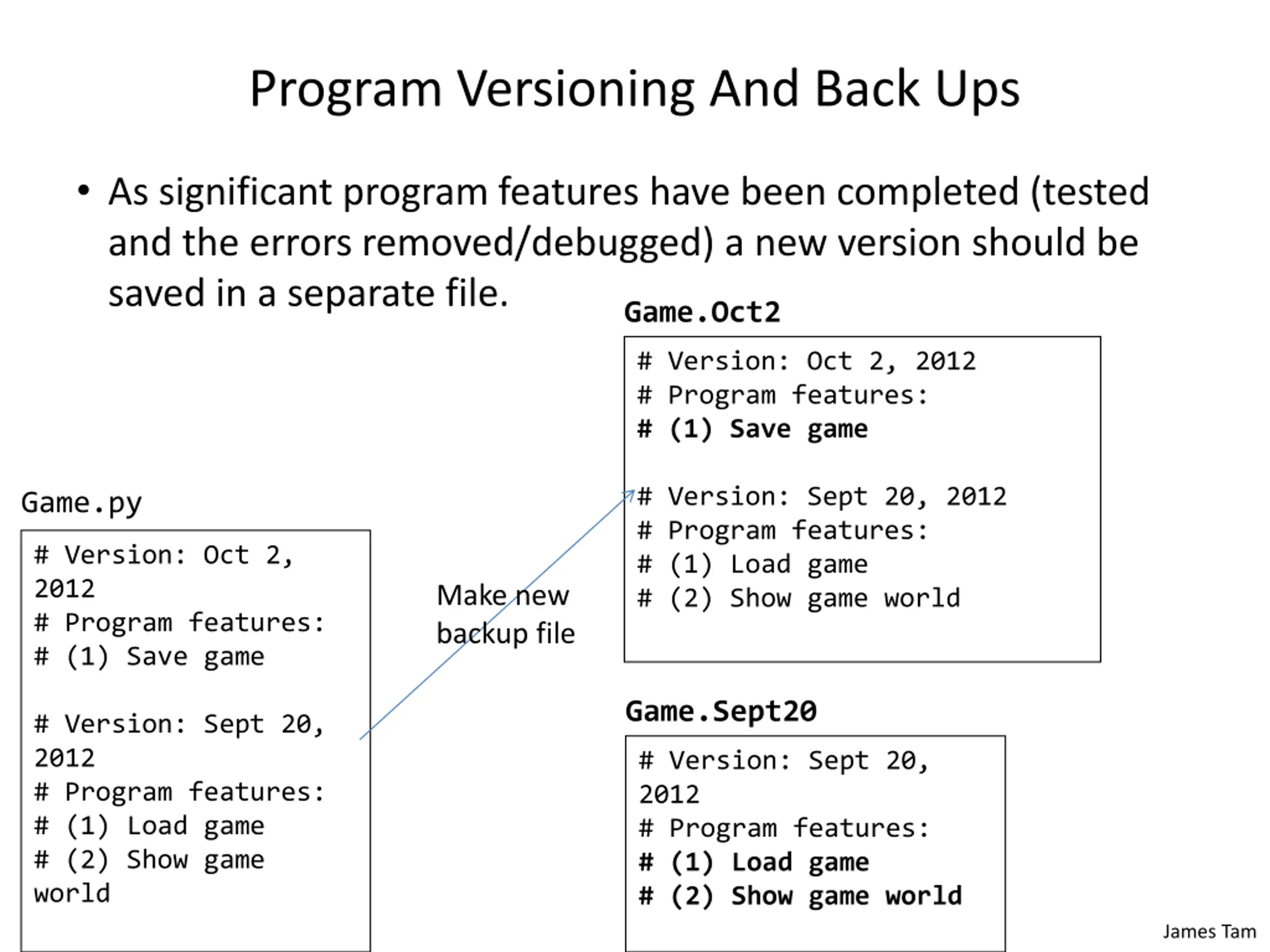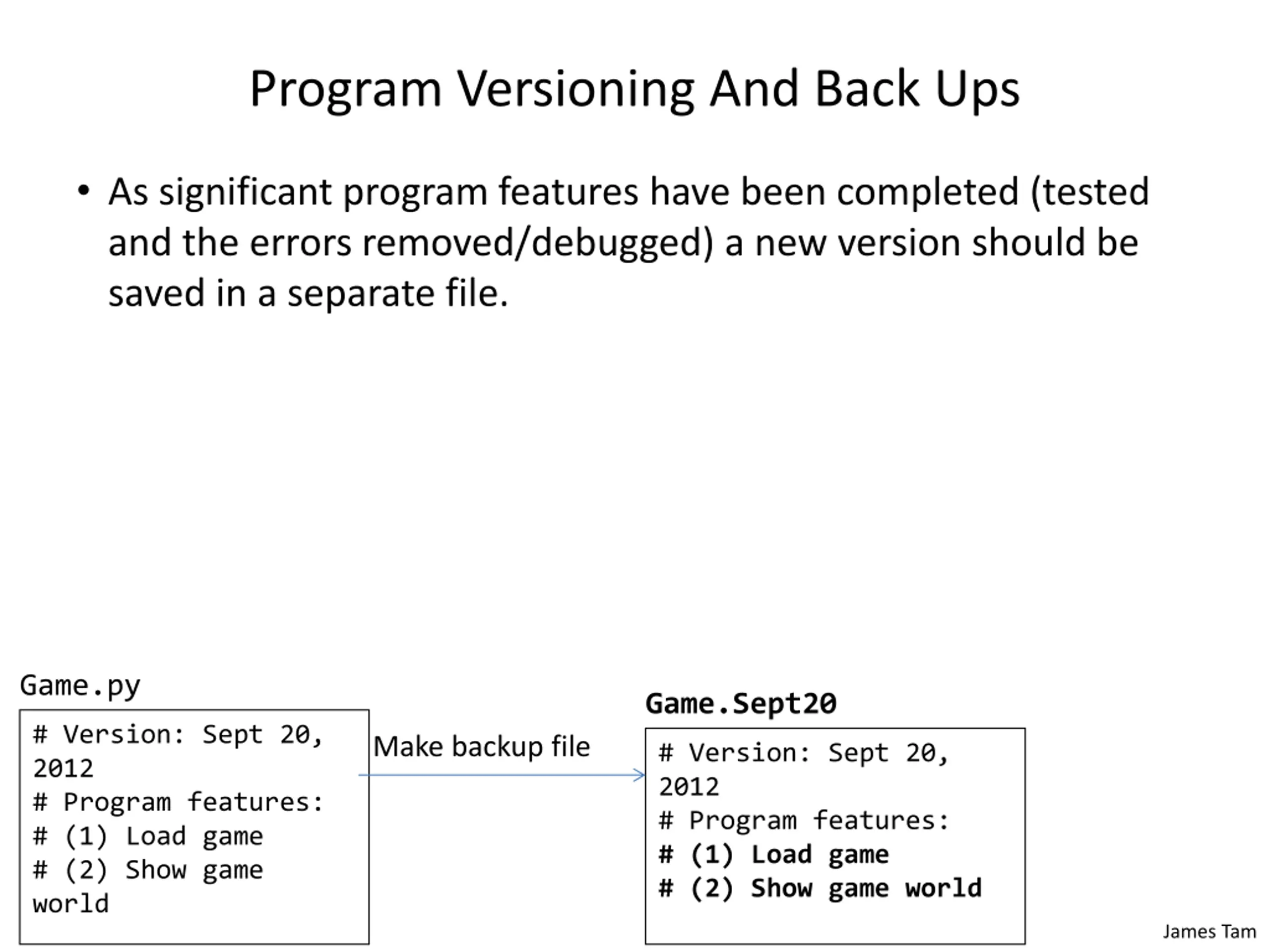 Program Versioning And Back Ups As significant program features have been completed (tested and the errors removed/debugged) a new version should be saved in a separate file. Game.py Game.Sept20 # Version: Sept 20, 2012 # Program features: # (1) Load game # (2) Show game world Make backup file # Version: Sept 20, 2012 # Program features: # (1) Load game # (2) Show game world James Tam
