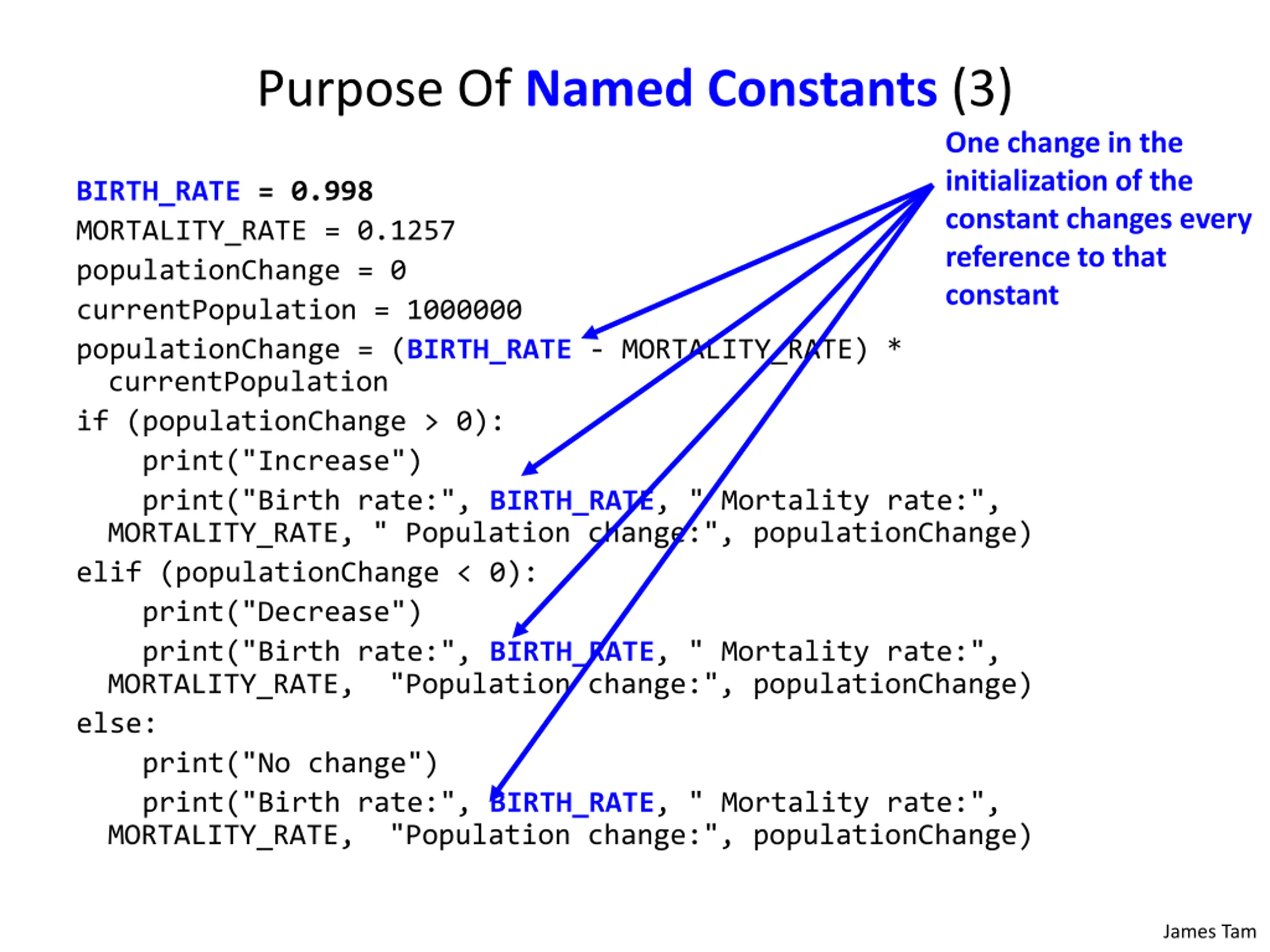 Purpose Of Named Constants (3) One change in the initialization of the constant changes every reference to that constant BIRTH_RATE= 0.998 MORTALITY_RATE = 0.1257 populationChange = 0 currentPopulation = 1000000 populationChange = (BIRTH_RATE - MORTALITY_RATE) * currentPopulation if (populationChange > 0): print("Increase") print("Birth rate:", BIRTH_RATE, " Mortality rate:", MORTALITY_RATE, " Population change:", populationChange) elif (populationChange < 0): print("Decrease") print("Birth rate:", BIRTH_RATE, " Mortality rate:", MORTALITY_RATE, "Population change:", populationChange) else: print("No change") print("Birth rate:", BIRTH_RATE, " Mortality rate:", MORTALITY_RATE, "Population change:", populationChange) James Tam