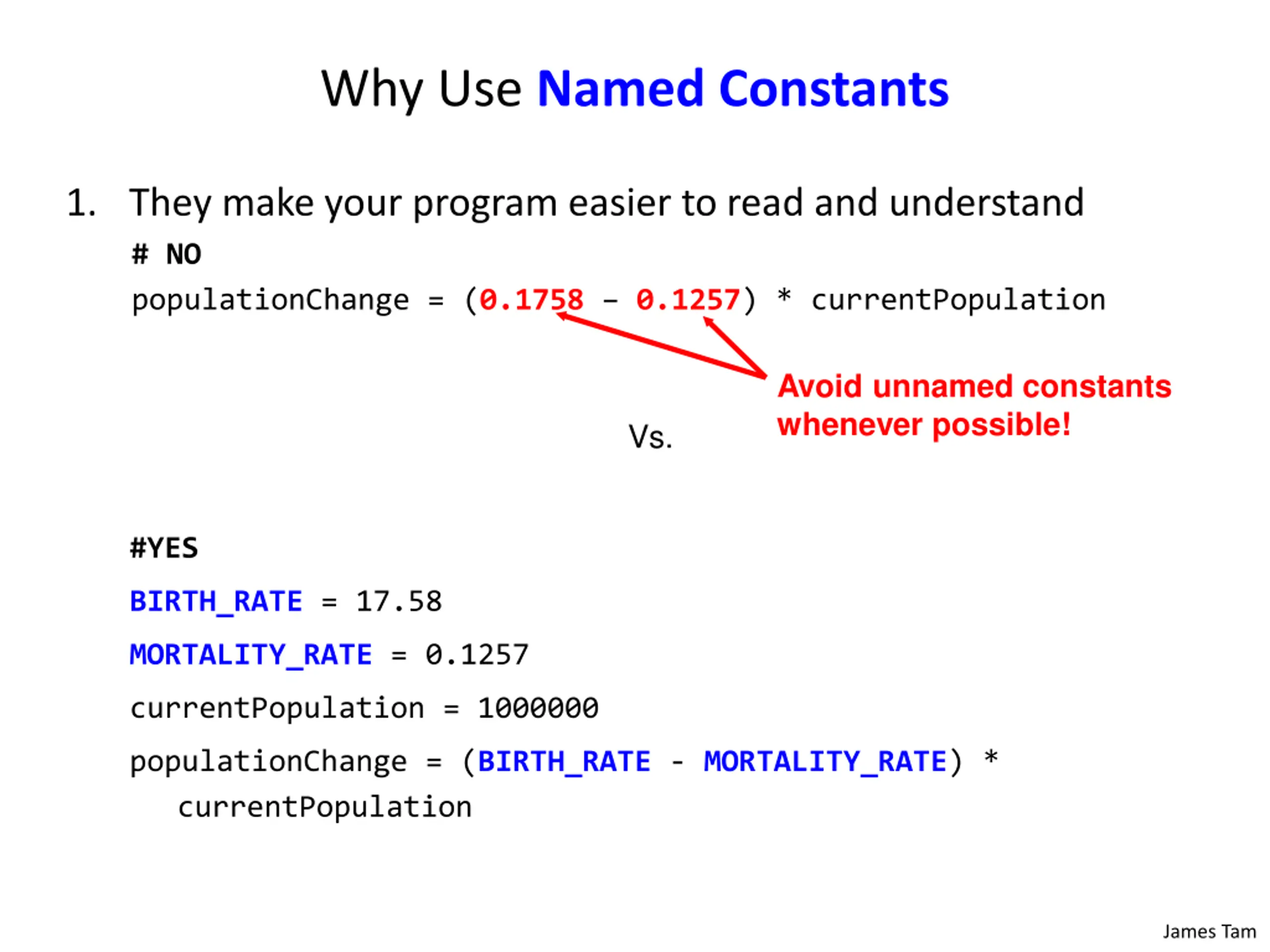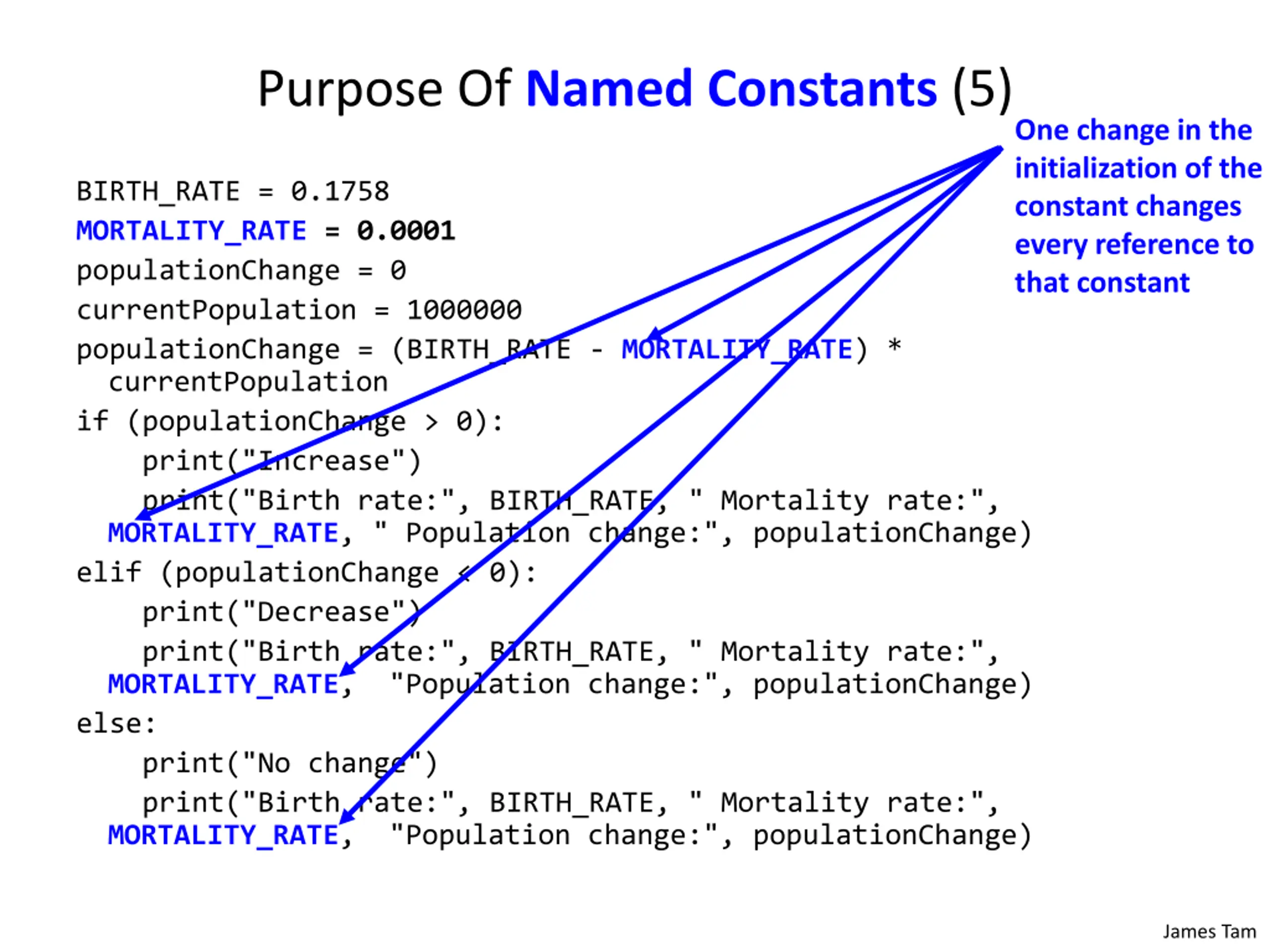 Purpose Of Named Constants (5) One change in the initialization of the constant changes every reference to that constant BIRTH_RATE = 0.1758 MORTALITY_RATE = 0.0001 populationChange = 0 currentPopulation = 1000000 populationChange = (BIRTH_RATE - MORTALITY_RATE) * currentPopulation if (populationChange > 0): print("Increase") print("Birth rate:", BIRTH_RATE, " Mortality rate:", MORTALITY_RATE, " Population change:", populationChange) elif (populationChange < 0): print("Decrease") print("Birth rate:", BIRTH_RATE, " Mortality rate:", MORTALITY_RATE, "Population change:", populationChange) else: print("No change") print("Birth rate:", BIRTH_RATE, " Mortality rate:", MORTALITY_RATE, "Population change:", populationChange) James Tam