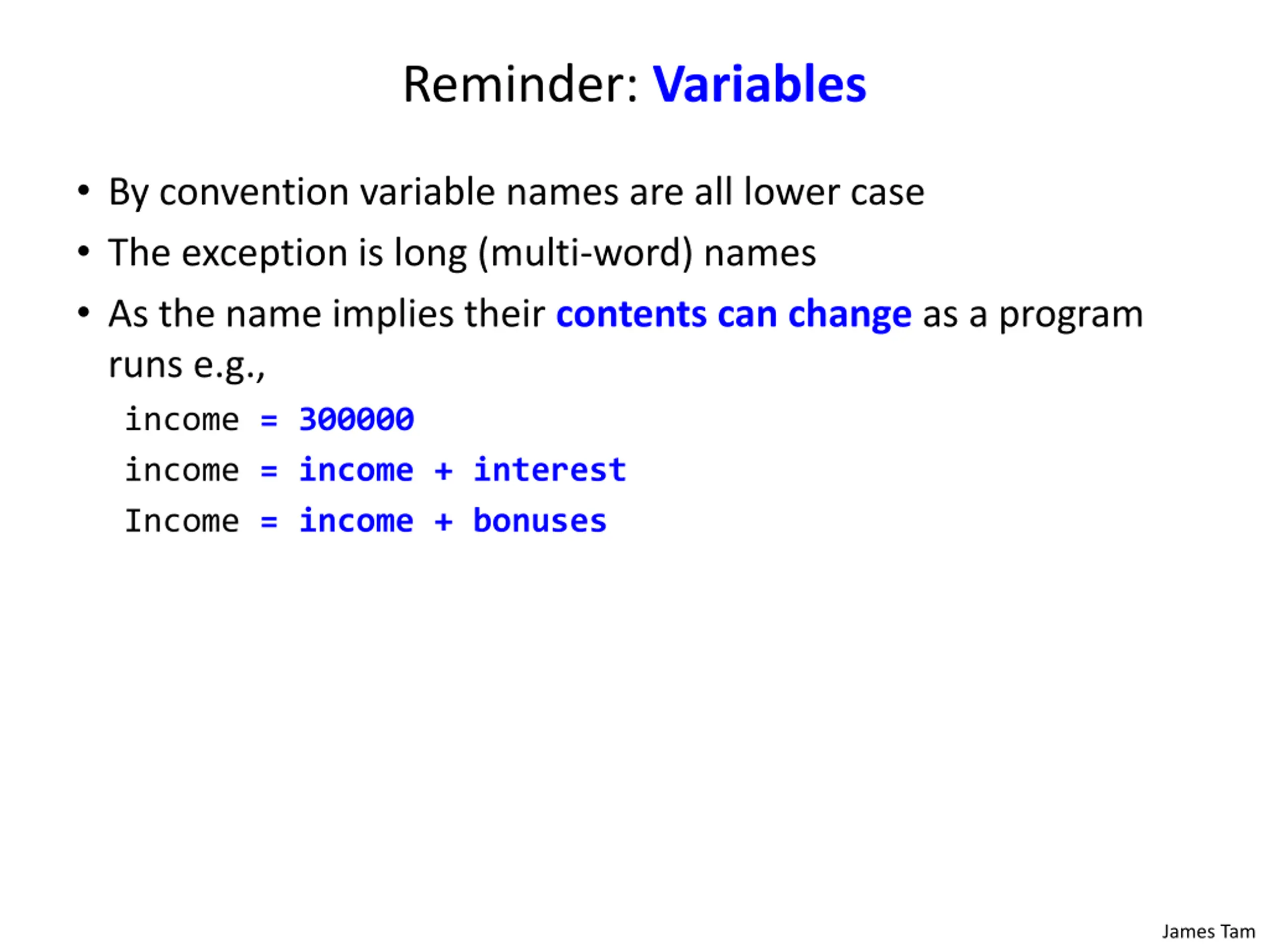 Reminder: Variables By convention variable names are all lower case The exception is long (multi-word) names As the name implies their contents can change as a program runs e.g., income = 300000 income = income + interest Income = income + bonuses James Tam