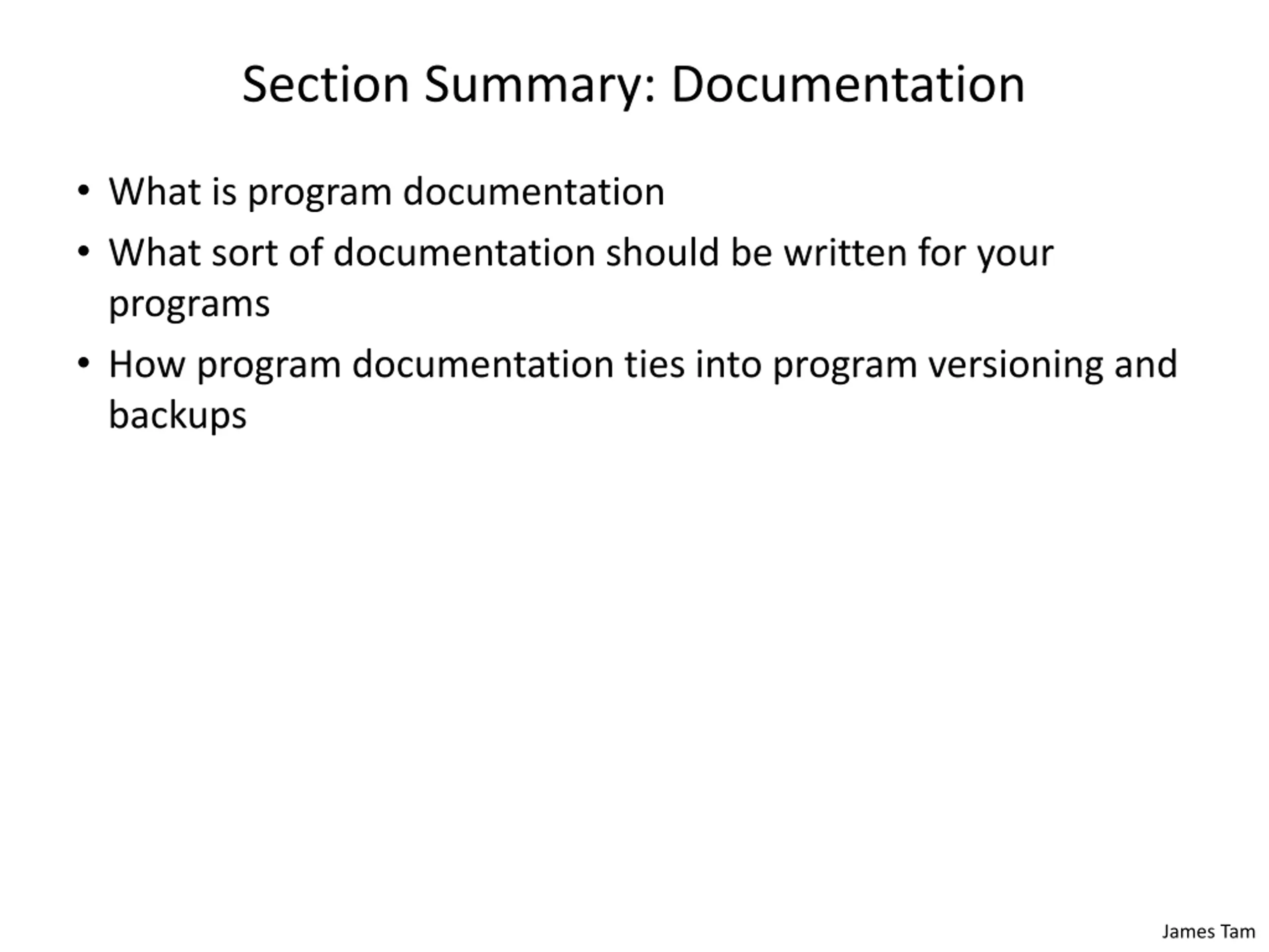 Section Summary: Documentation What is program documentation What sort of documentation should be written for your programs How program documentation ties into program versioning and backups James Tam