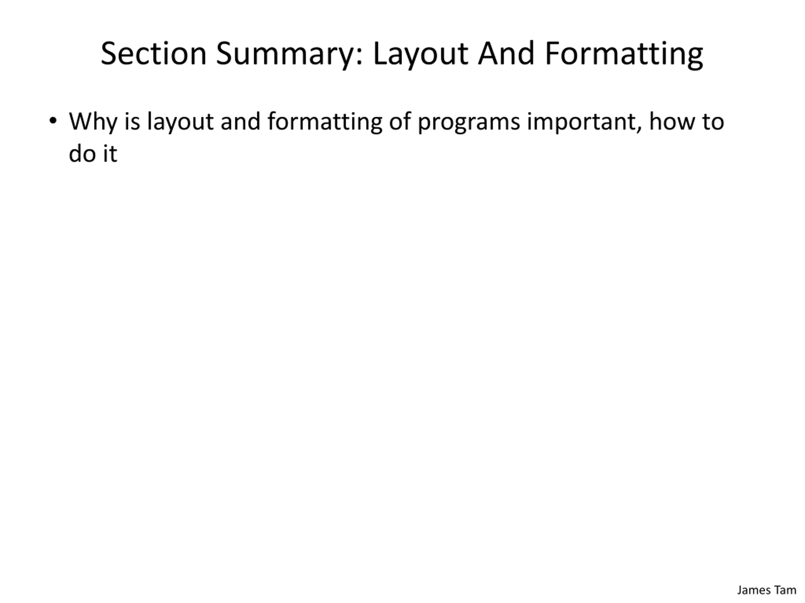 Section Summary: Layout And Formatting Why is layout and formatting of programs important, how to do it James Tam