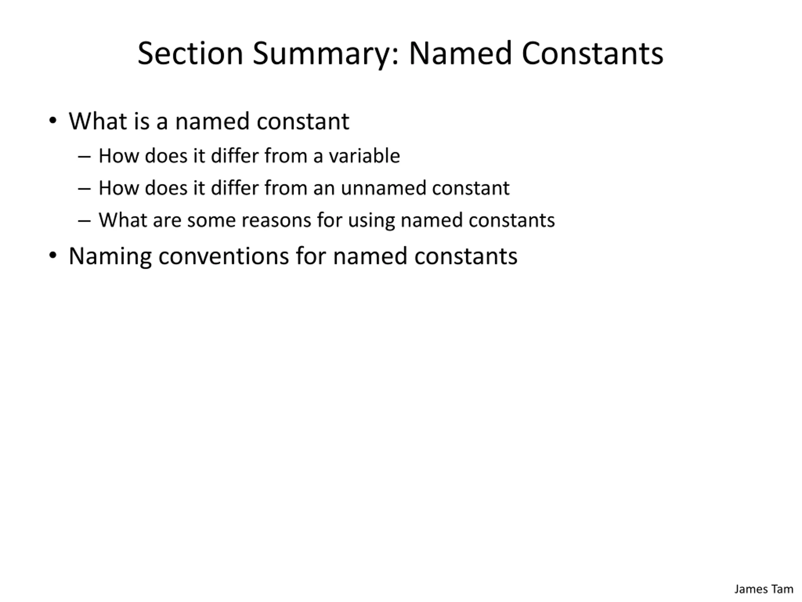 Section Summary: Named Constants What is a named constant How does it differ from a variable How does it differ from an unnamed constant What are some reasons for using named constants Naming conventions for named constants James Tam