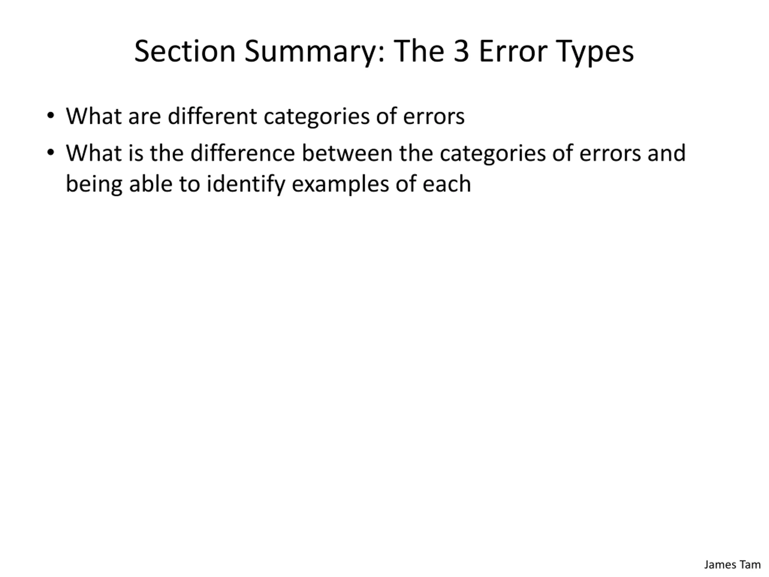 Section Summary: The 3 Error Types What are different categories of errors What is the difference between the categories of errors and being able to identify examples of each James Tam