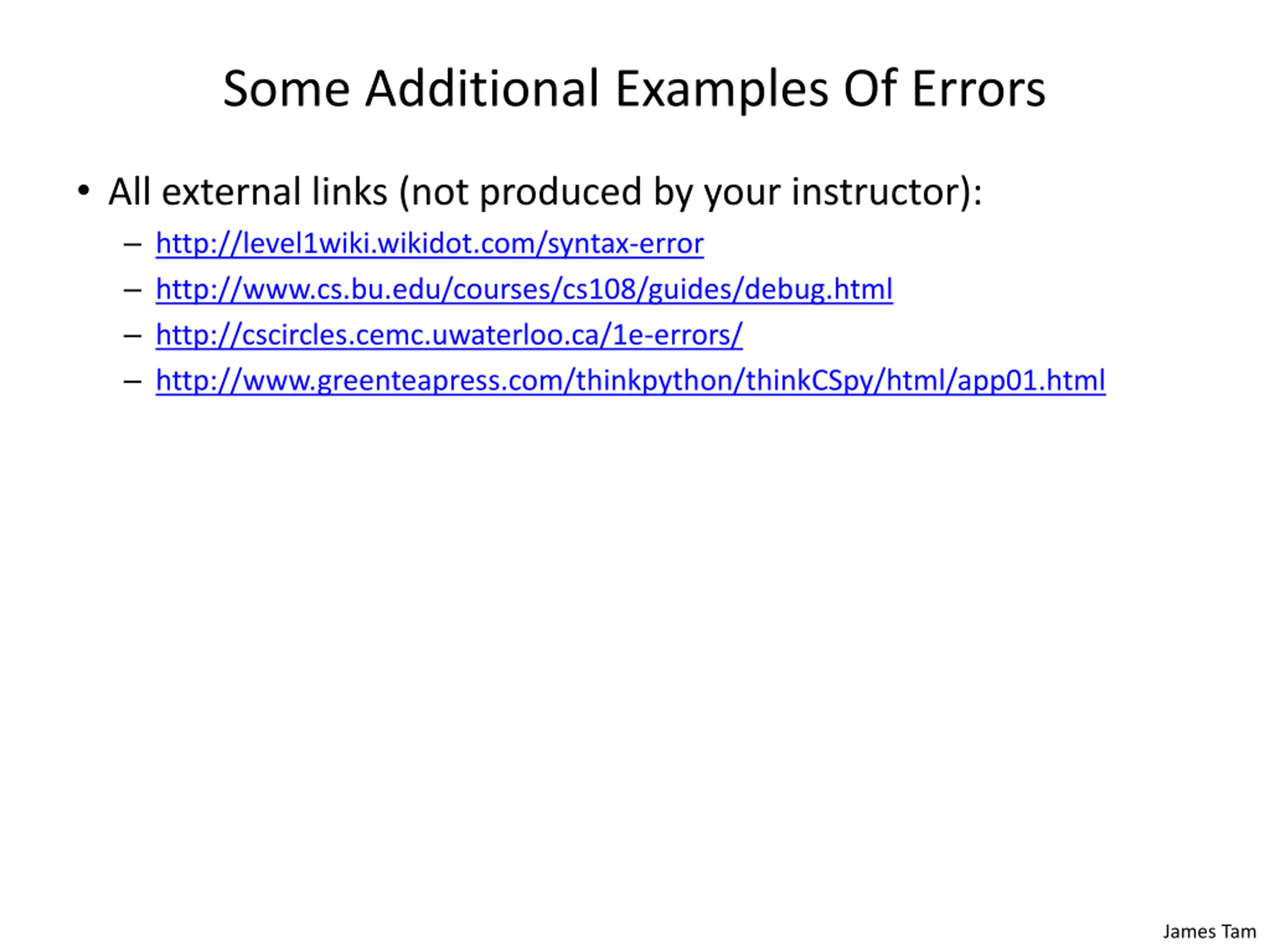 Some Additional Examples Of Errors All external links (not produced by your instructor): http://level1wiki.wikidot.com/syntax-error http://www.cs.bu.edu/courses/cs108/guides/debug.html http://cscircles.cemc.uwaterloo.ca/1e-errors/ http://www.greenteapress.com/thinkpython/thinkCSpy/html/app01.html James Tam