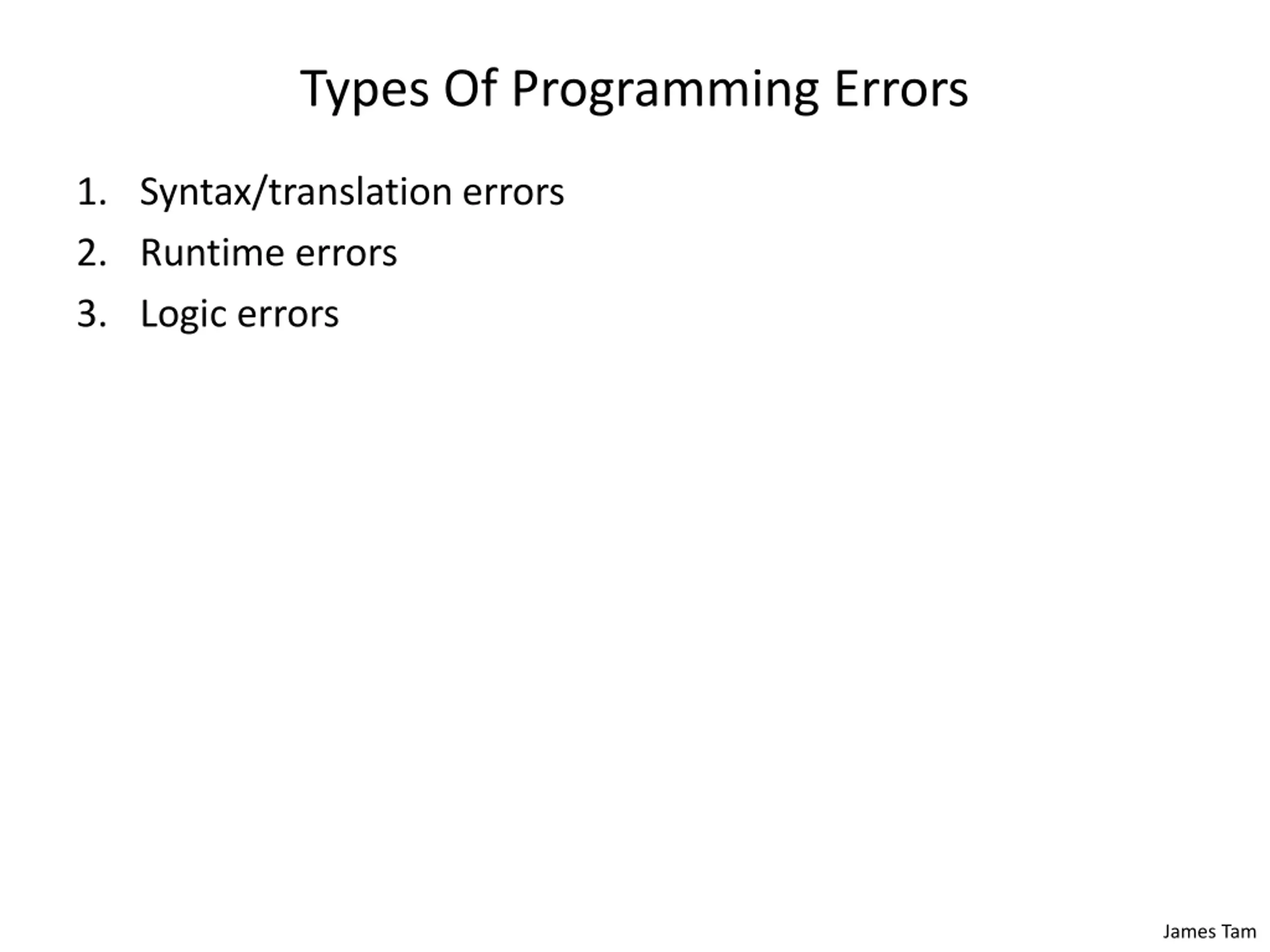 Types Of Programming Errors 1. Syntax/translation errors 2. Runtime errors 3. Logic errors James Tam