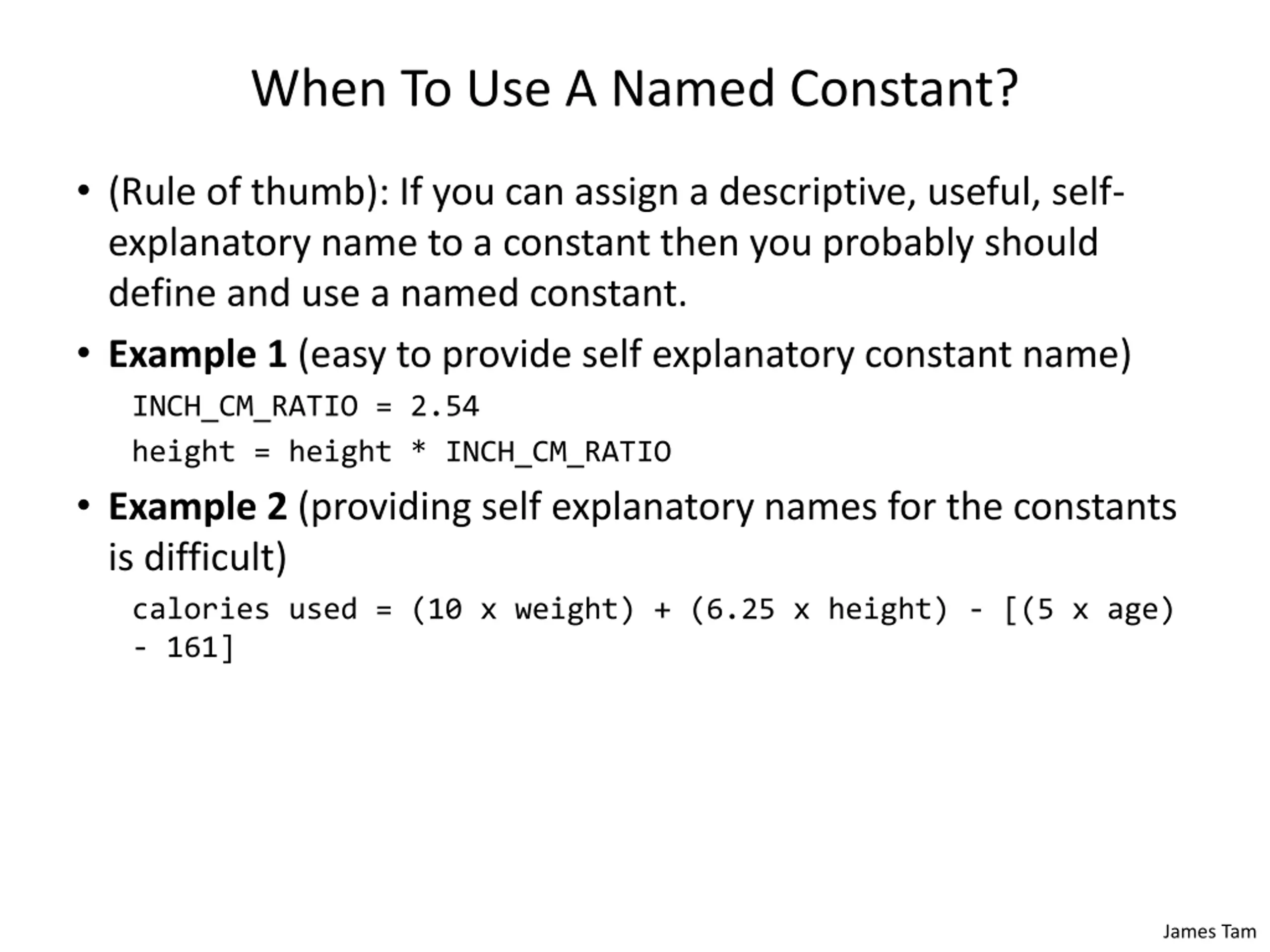 When To Use A Named Constant? (Rule of thumb): If you can assign a descriptive, useful, self- explanatory name to a constant then you probably should define and use a named constant. Example 1 (easy to provide self explanatory constant name) INCH_CM_RATIO = 2.54 height = height * INCH_CM_RATIO Example 2 (providing self explanatory names for the constants is difficult) calories used = (10 x weight) + (6.25 x height) - [(5 x age) - 161] James Tam