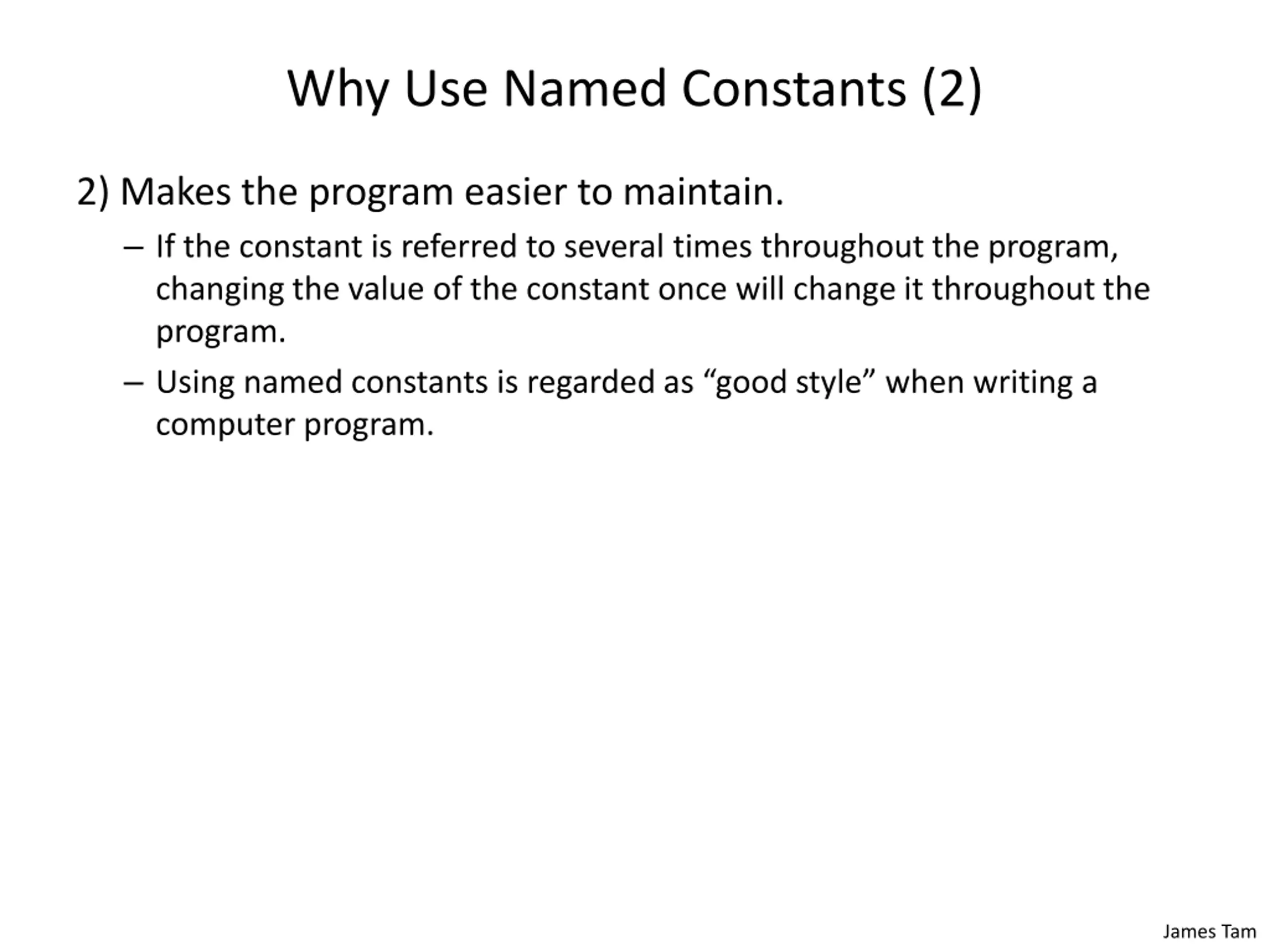 Why Use Named Constants (2) 2) Makes the program easier to maintain. If the constant is referred to several times throughout the program, changing the value of the constant once will change it throughout the program. Using named constants is regarded as good style when writing a computer program. James Tam