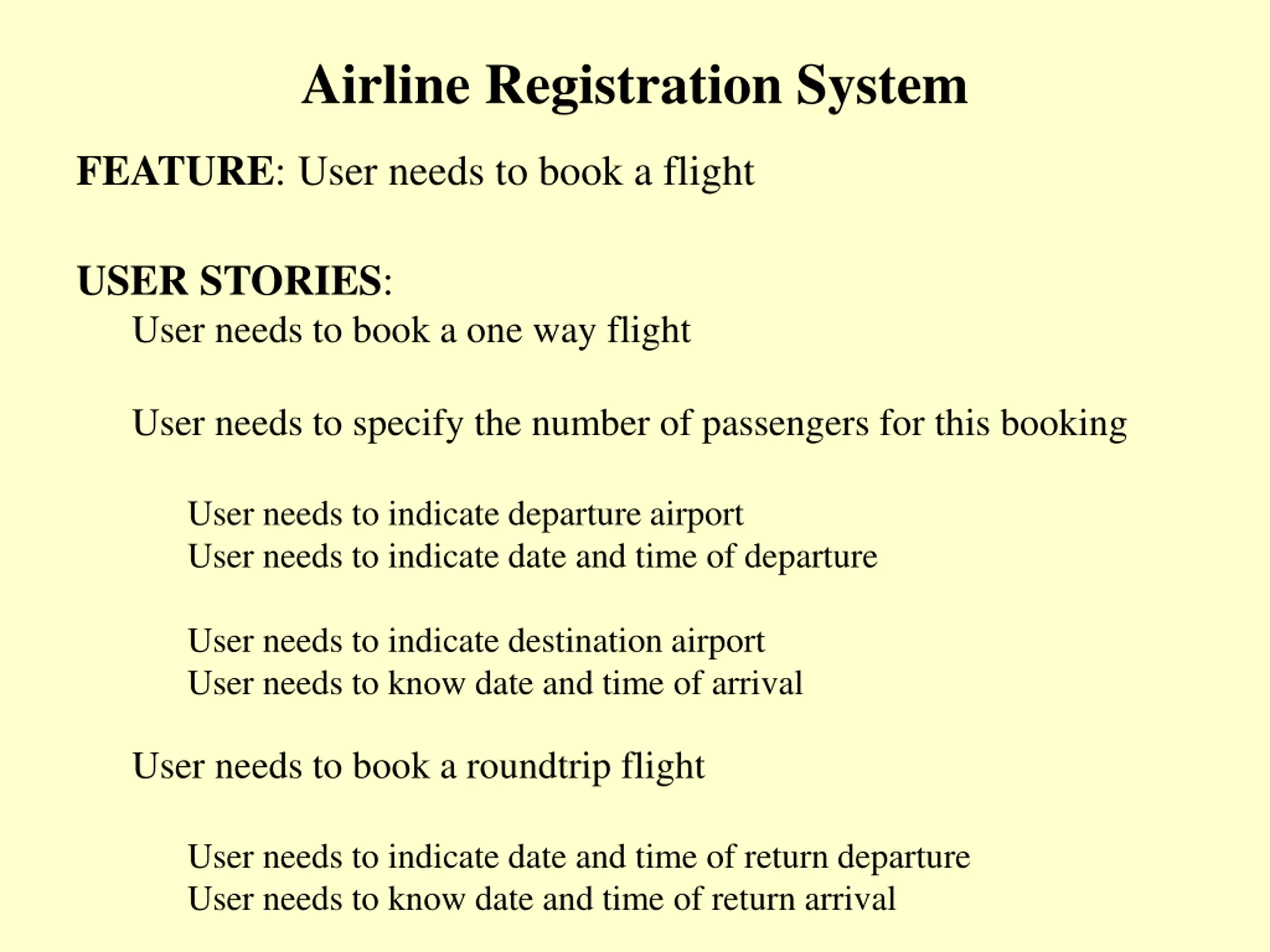 Airline Registration System FEATURE: User needs to book a flight USER STORIES: User needs to book a one way flight User needs to specify the number of passengers for this booking User needs to indicate departure airport User needs to indicate date and time of departure User needs to indicate destination airport User needs to know date and time of arrival User needs to book a roundtrip flight User needs to indicate date and time of return departure User needs to know date and time of return arrival