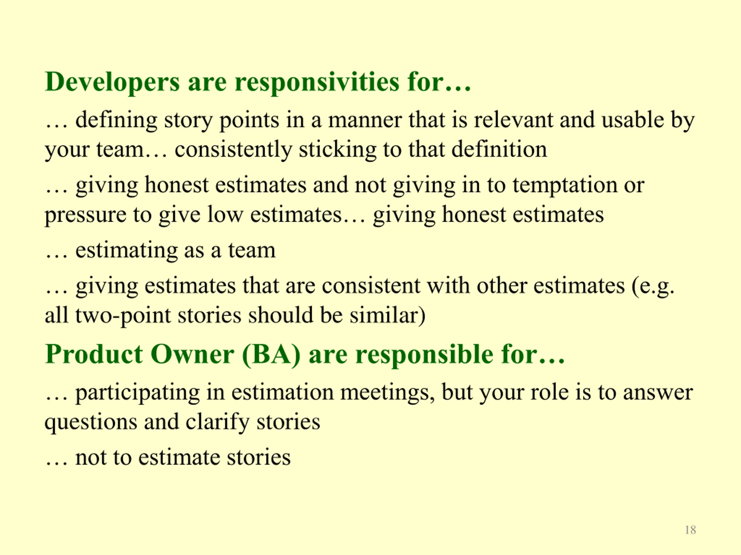 Developers are responsivities for defining story points in a manner that is relevant and usable by your team consistently sticking to that definition giving honest estimates and not giving in to temptation or pressure to give low estimates giving honest estimates estimating as a team giving estimates that are consistent with other estimates (e.g. all two-point stories should be similar) Product Owner (BA) are responsible for participating in estimation meetings, but your role is to answer questions and clarify stories not to estimate stories 18