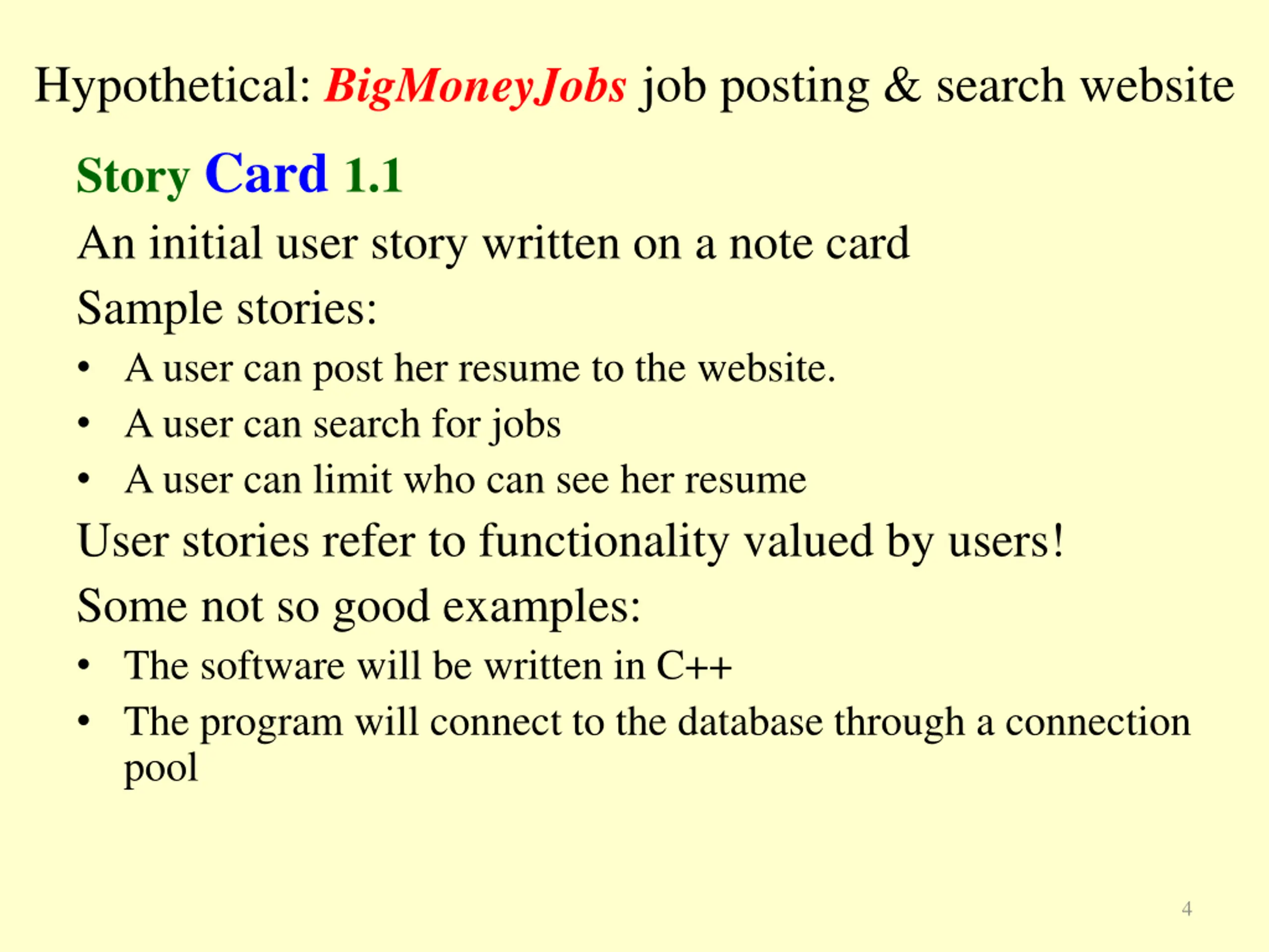 Hypothetical: BigMoneyJobs job posting & search website Story Card 1.1 An initial user story written on a note card Sample stories: A user can post her resume to the website. A user can search for jobs A user can limit who can see her resume User stories refer to functionality valued by users! Some not so good examples: The software will be written in C++ The program will connect to the database through a connection pool 4