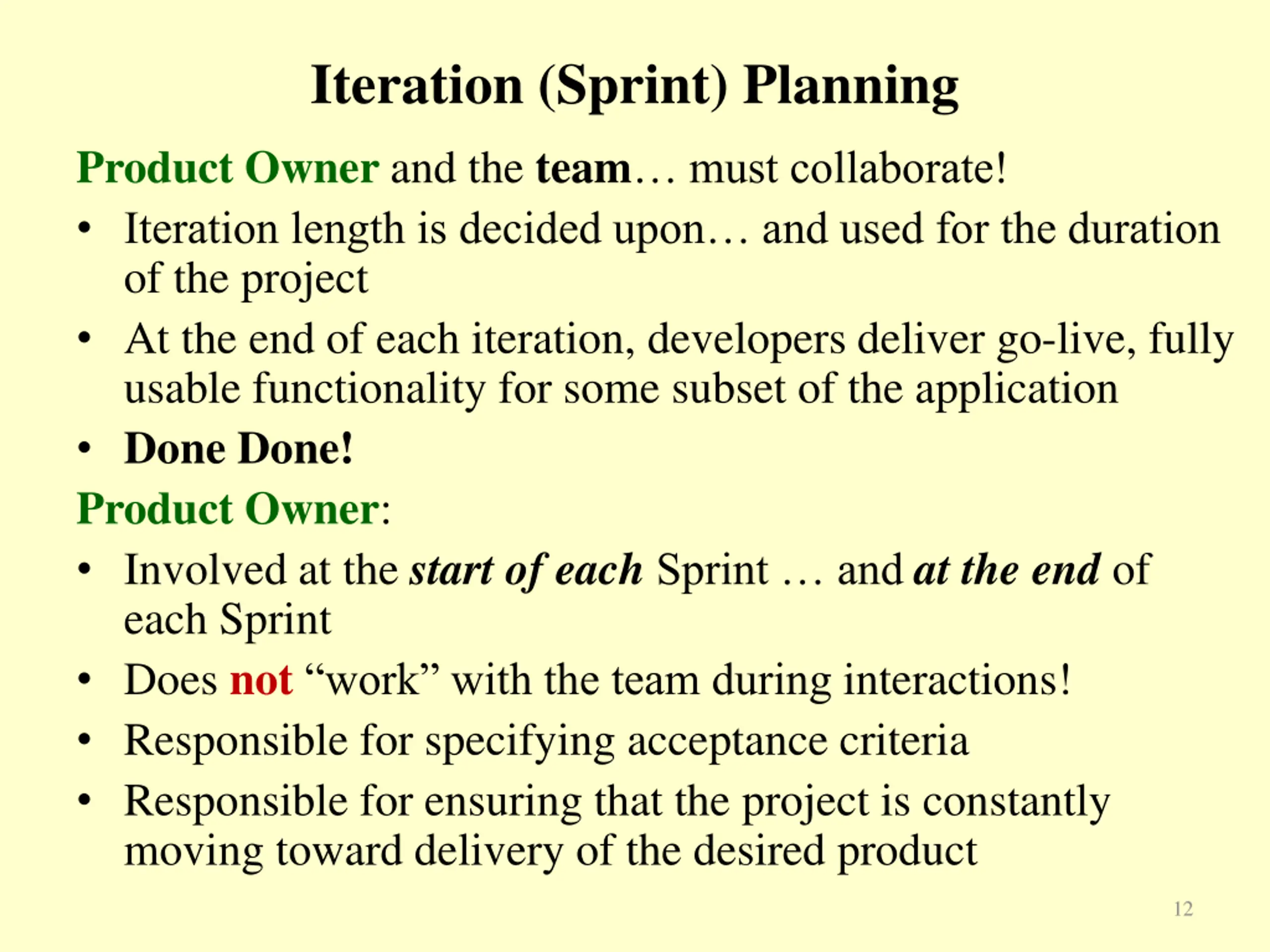 Iteration (Sprint) Planning Product Owner and the team must collaborate! Iteration length is decided upon and used for the duration of the project At the end of each iteration, developers deliver go-live, fully usable functionality for some subset of the application Done Done! Product Owner: Involved at the start of eachSprint and at the end of each Sprint Does not work with the team during interactions! Responsible for specifying acceptance criteria Responsible for ensuring that the project is constantly moving toward delivery of the desired product 12