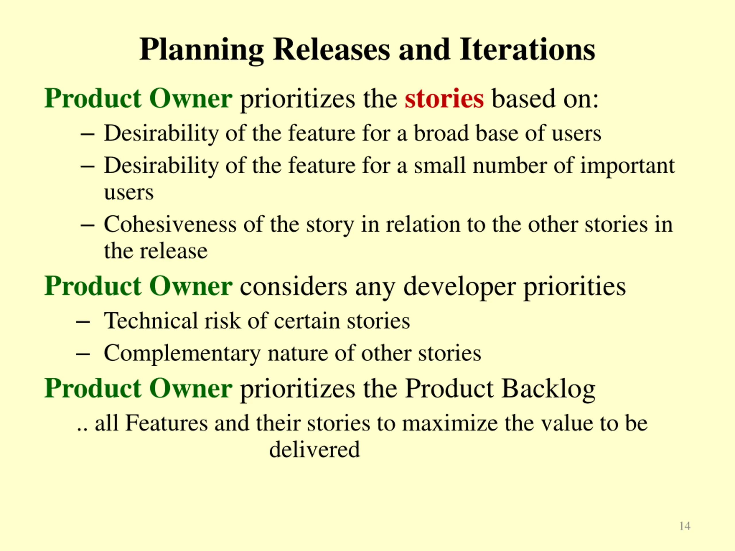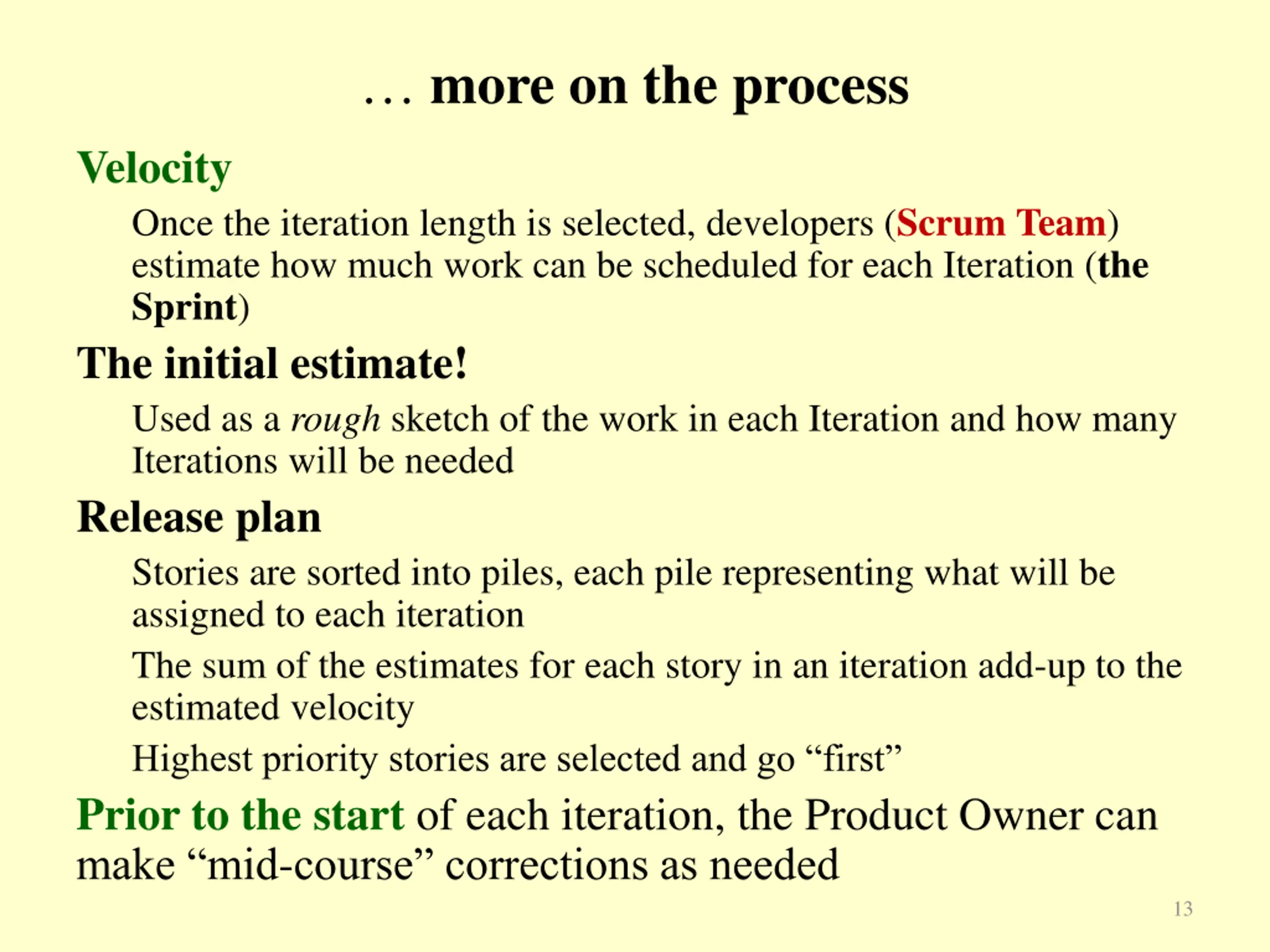 more on the process Velocity Once the iteration length is selected, developers (Scrum Team) estimate how much work can be scheduled for each Iteration (the Sprint) The initial estimate! Used as a rough sketch of the work in each Iteration and how many Iterations will be needed Release plan Stories are sorted into piles, each pile representing what will be assigned to each iteration The sum of the estimates for each story in an iteration add-up to the estimated velocity Highest priority stories are selected and go first Prior to the start of each iteration, the Product Owner can make mid-course corrections as needed 13
