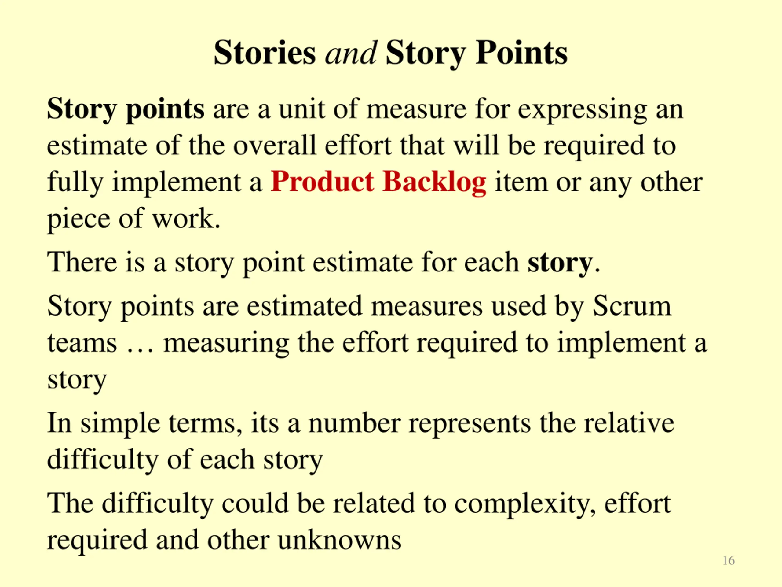 StoriesandStory Points Story points are a unit of measure for expressing an estimate of the overall effort that will be required to fully implement a Product Backlog item or any other piece of work. There is a story point estimate for each story. Story points are estimated measures used by Scrum teams measuring the effort required to implement a story In simple terms, its a number represents the relative difficulty of each story The difficulty could be related to complexity, effort required and other unknowns 16