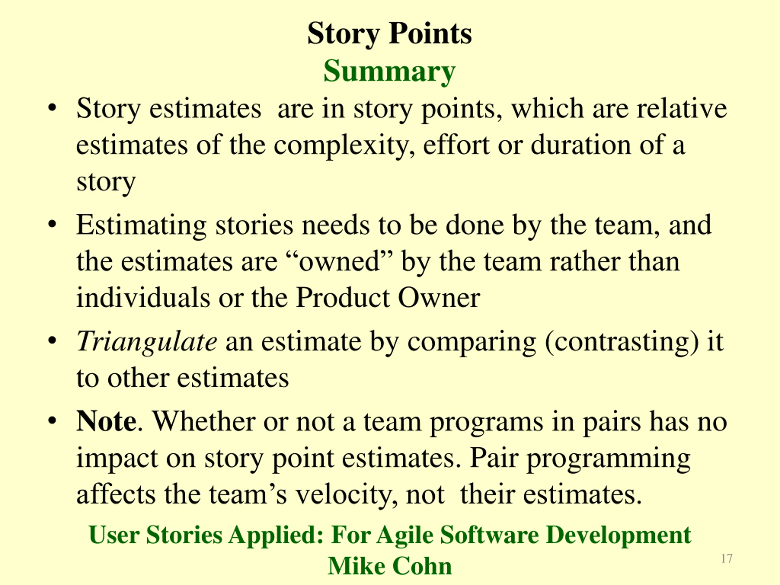 Story Points Summary Story estimates are in story points, which are relative estimates of the complexity, effort or duration of a story Estimating stories needs to be done by the team, and the estimates are owned by the team rather than individuals or the Product Owner Triangulate an estimate by comparing (contrasting) it to other estimates Note. Whether or not a team programs in pairs has no impact on story point estimates. Pair programming affects the team s velocity, not their estimates. User Stories Applied: For Agile Software Development Mike Cohn 17